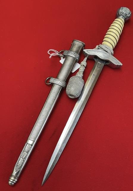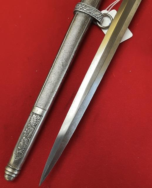 Scarce maker, excellent white grip, wire nice and tight, blade in excellent condition, dent free scabbard, complete with knot which shows usual wear. Overall EX dagger