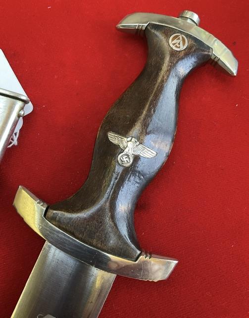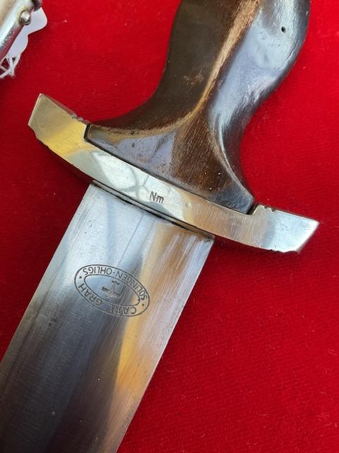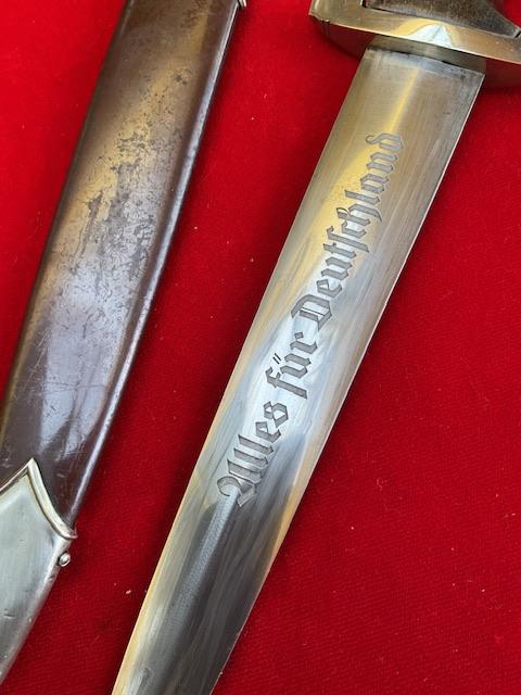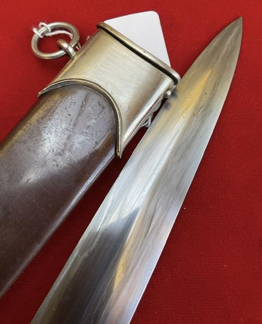 Rarity of 9, blade in excellent condition, no rust or nicks, cross grain remaining, with minor runner marks. Anadoised dent free scabbard, nickel fittings, screws un turned, minor dents to bottom fitting. Grip fits perfect to cross guards, overall EXC++ item for very rare maker.