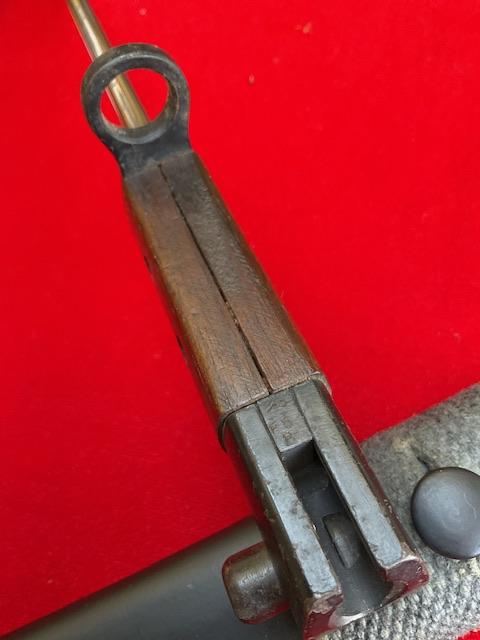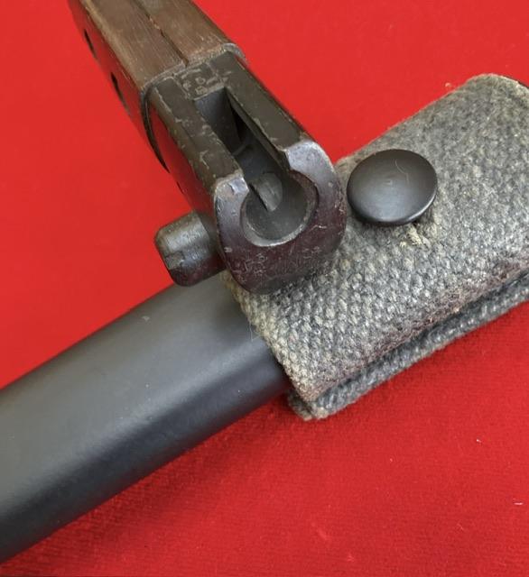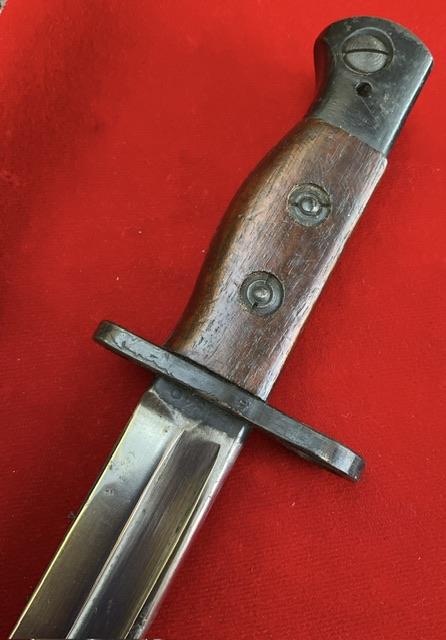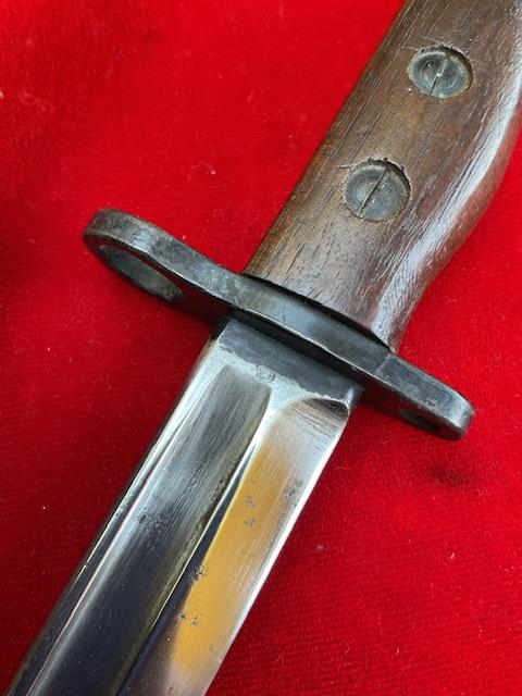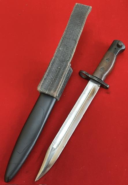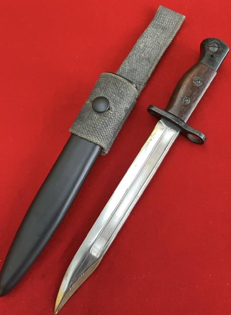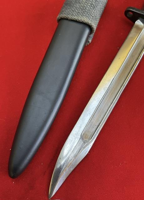 Production run of 2400 so a scarce item, nice bright blade, no nicks or rust, scabbard is near mint. Excellent 2 piece wood grips a depress stud in working order, come with frog. Age restricted item.
