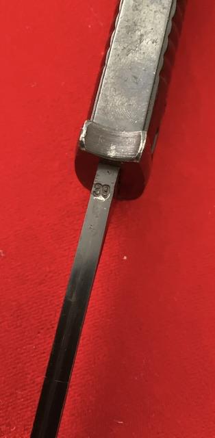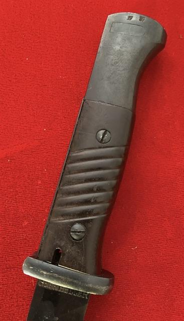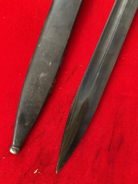 Matching number, blued blade which shows minor wear, dent free scabbard, 1939 dated, Bakerlite grips, press stud in good working order. Scarce maker date combination. Age restricted item