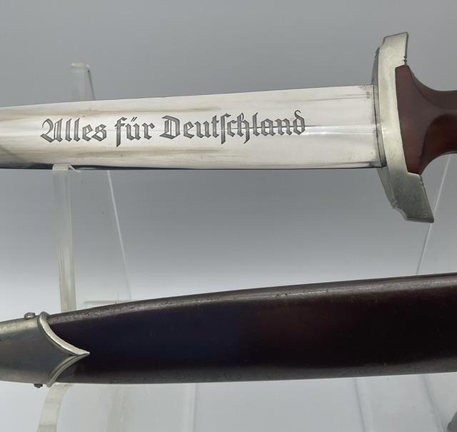 A stunning SA dagger by Hugo Linder, The blade is near mint, full cross grain, no nicks or rust marks. Scabbard is anodised with majority of lacquer in place. All nickel fittings, un turned screws, Perfect grip and perfect fit to cross guards, comes with 3 piece hanger. Would be very hard to up grade stunning dagger.