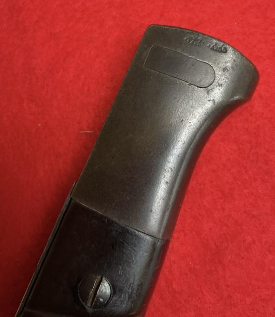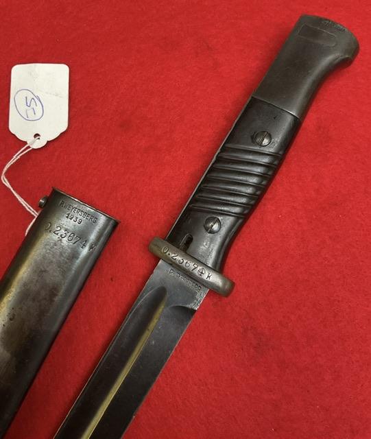 P Weyersberg, 1939 dated. Blued blade with wear at tip, dent free scabbard, baker lite grip securely held, press stud in good working order.