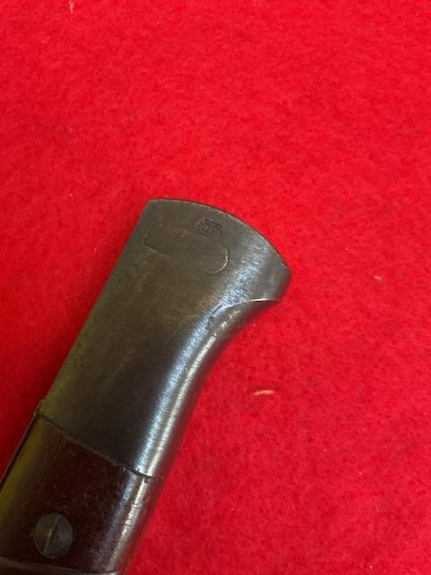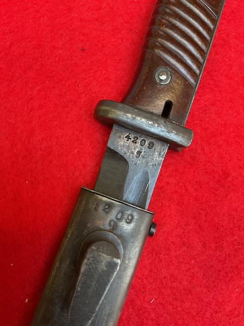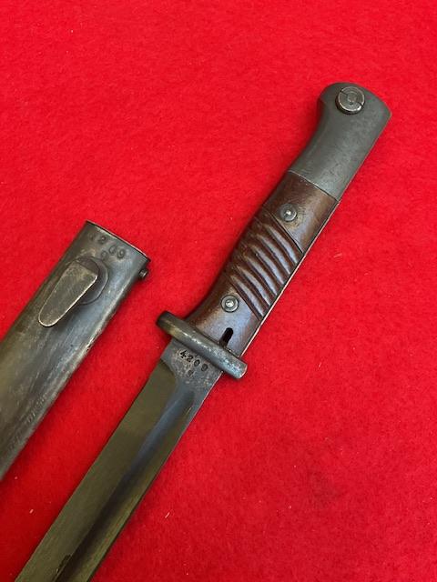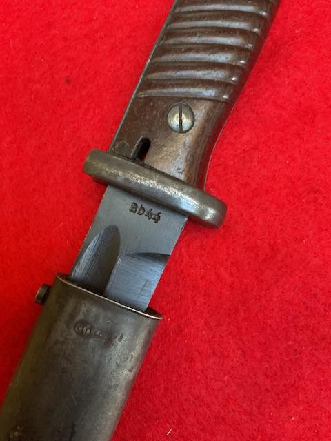 Scarce maker K98 AB44, nice blued blade, only minor wear, dent free scabbard, baker lite grips. Press stud in good working order. Age restricted item
