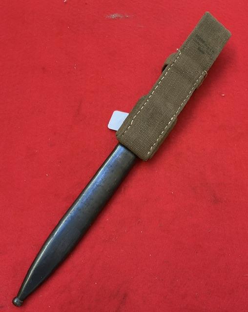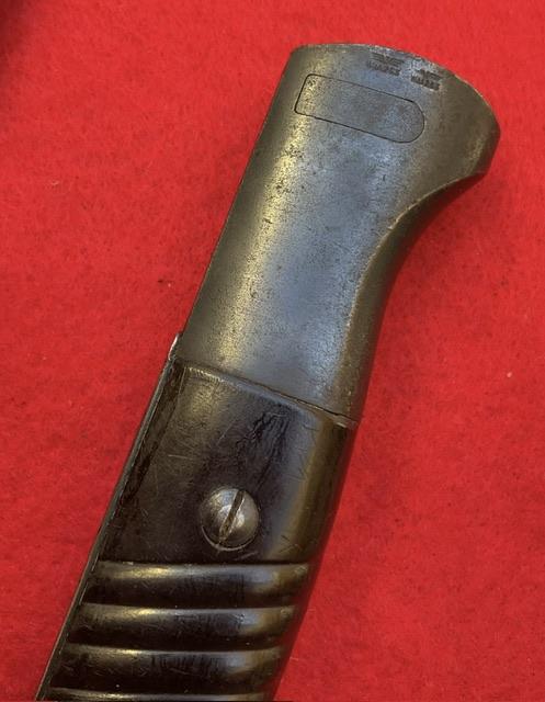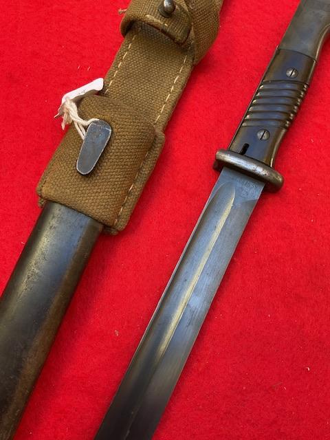 A matching 1939 K98 by J Corts,, excellent blued blade with very minor wear. Dent free scabbard, Baker lite grips securely held in place. Release catch in good working order. Comes with mint DAK tropical frog,, In near mint condition, stitching perfect.
