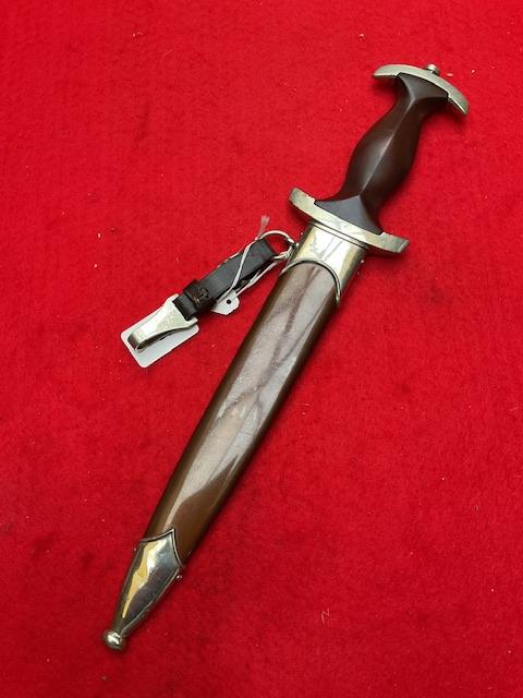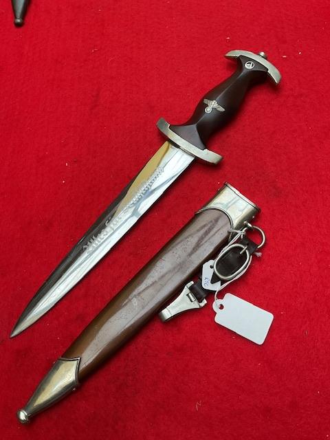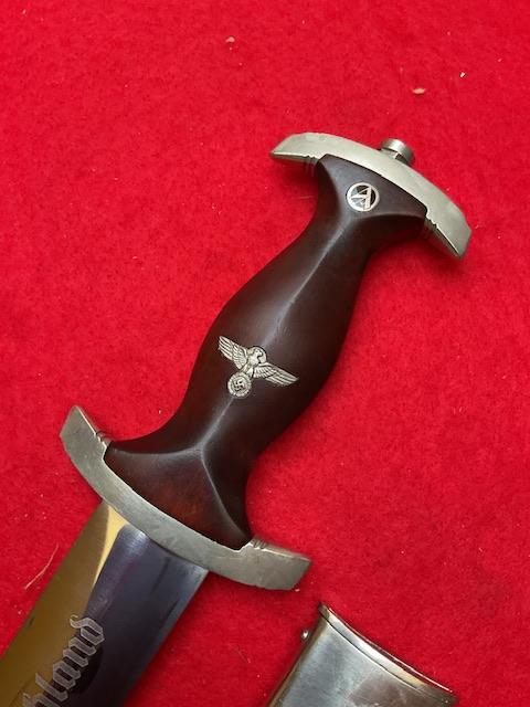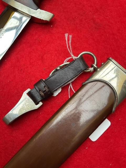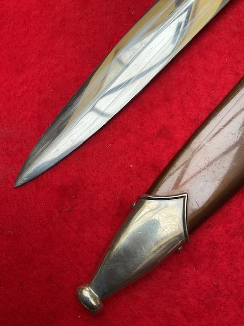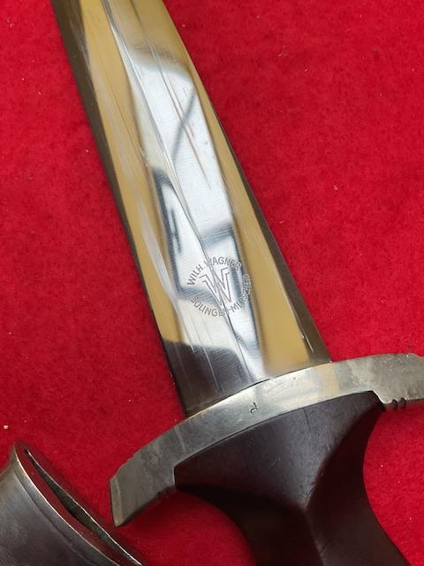 SA by W Wagner, stunning blade with majority of cross grain, minor runner marks, anodised scabbard shown lacquer, all nickel fittings, screws un turned, grip has excellent fit to cross guards.
