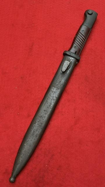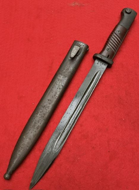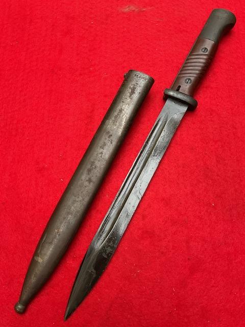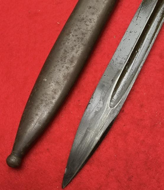 Scarce date for maker Joshua Corts, excellent blued blade, nick and rust free. Dent free scabbard with light surface rust spots but nothing detrimental. Baker lite grips nice and secure, press stud in good working order.