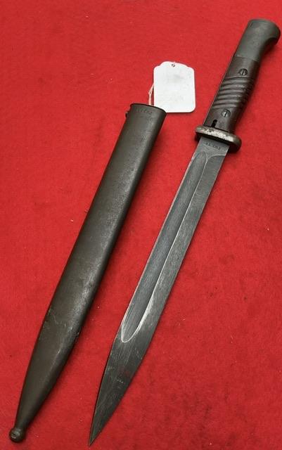 Matching number Alex Coppel, blued blade, with surface wear to tip, excellent dent free scabbard, excellent baker lite grips, press stud in good working order. Age restricted item