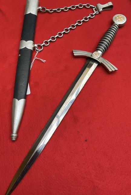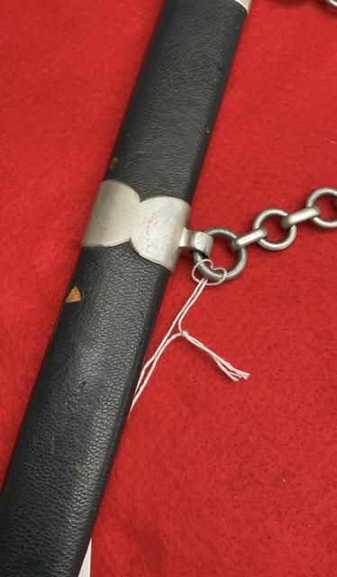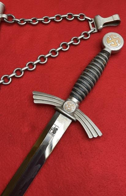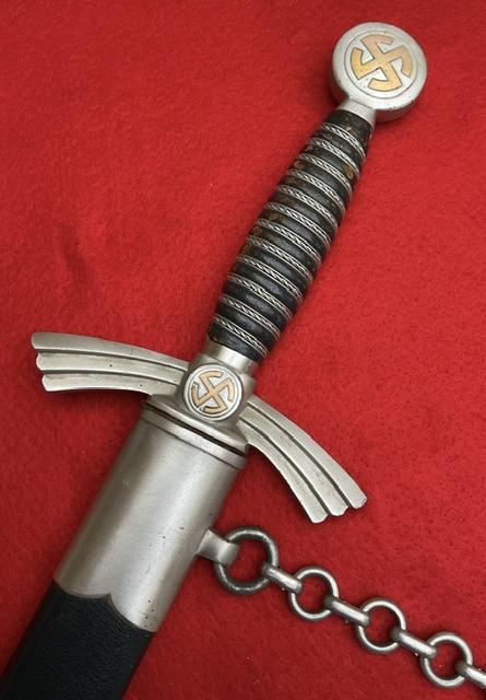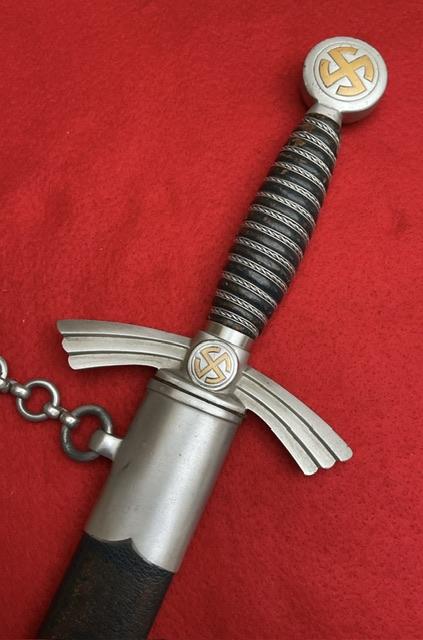 Aluminium 1st Pattern Luftwaffe dagger by Eickhorn, blade in excellent condition, no nicks or rust. Dent free scabbard, minor scuff to leather, grip in excellent condition, nice tight wire. Excellent item.
