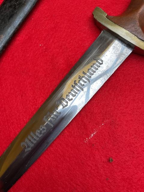 A lovely salty NSKK dagger, lovely patina on all fittings. Blade is in excellent condition, no nicks or rust, period painted scabbard, shows wear but that adds character as can see the original brown scabbard, all nickel fittings, minor dent to ball, excellent grip,, I do like items that show this type of patina .