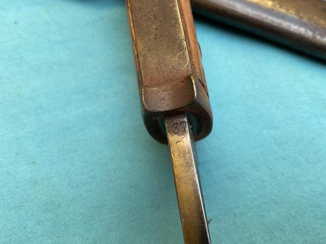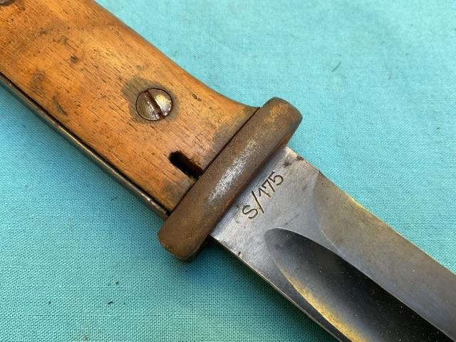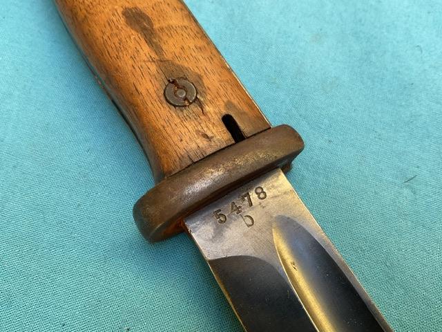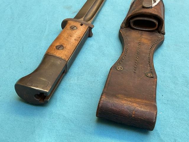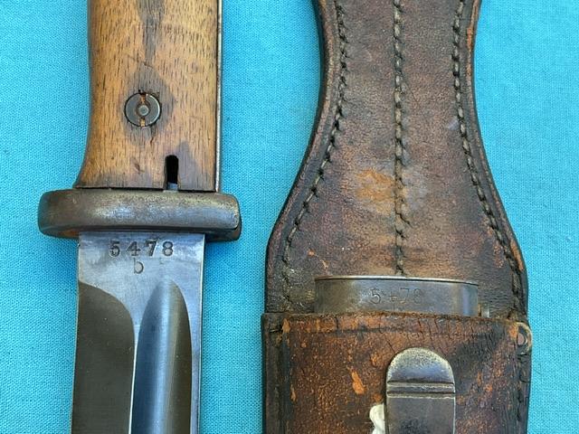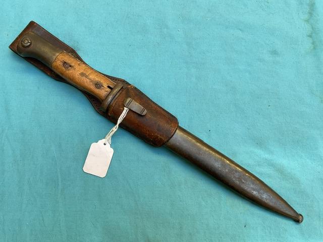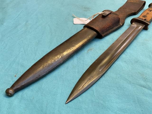 FW Holler K98 , matching number. Near mint blued blade dated 37. Scabbard is dent free with minor thumb nail rust patch. Wood grip and press stud works. Comes with frog, 1 of rivets is missing.
