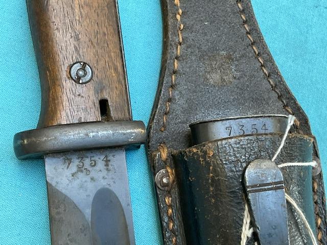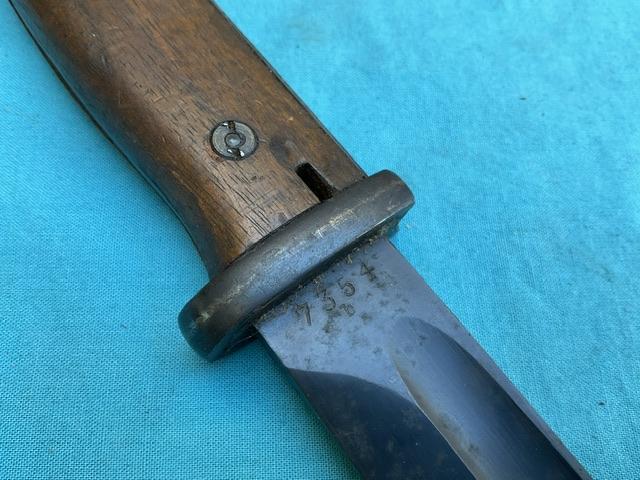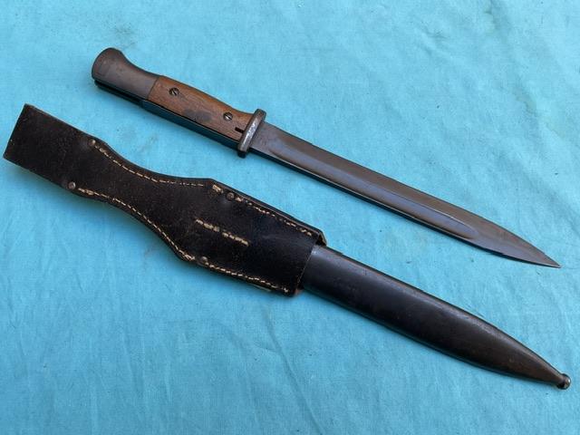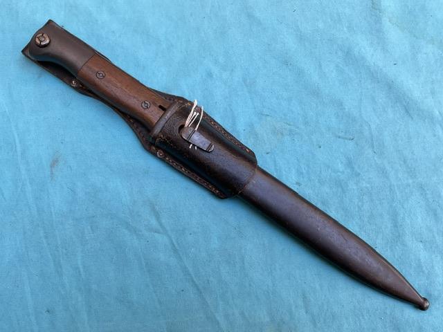 K98 S184 code Joshua Cortes bayonet. Nice blued blade with minor wear. Scabbard dent free, wood grip, and press stud works.Cant see date ? Comes with maker marked frog. Overall EX+ for scarce item.