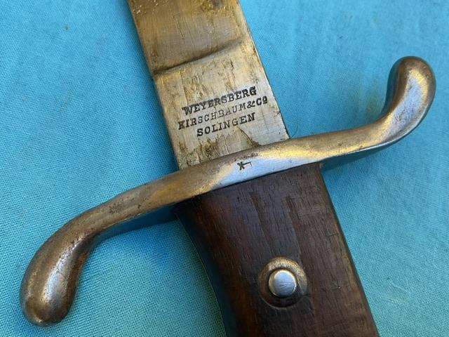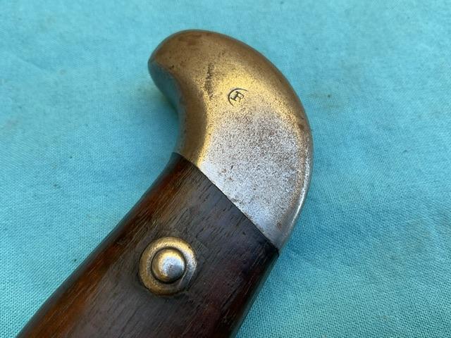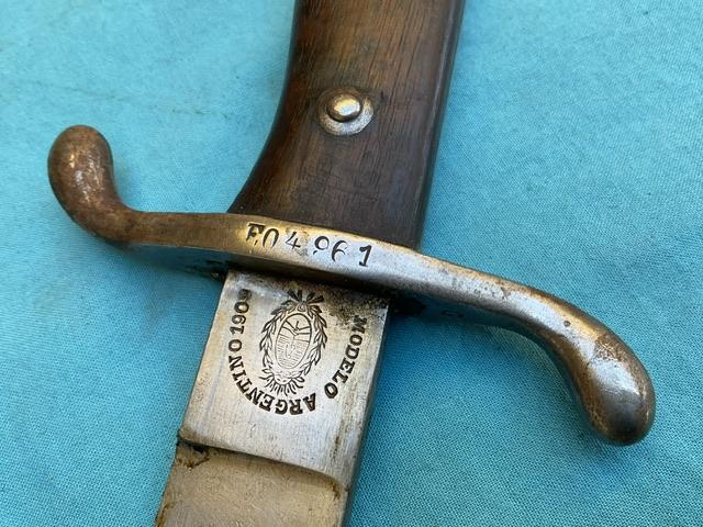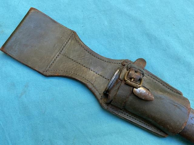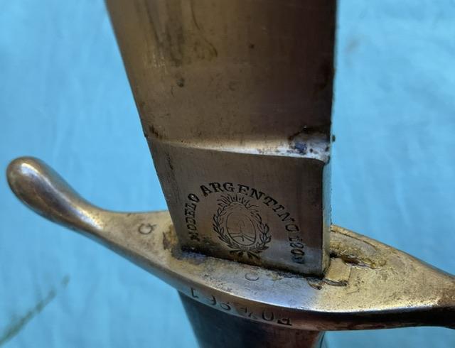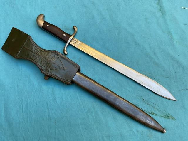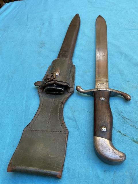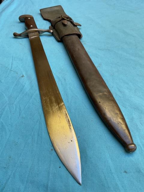 A nice example of a 1909 Artilery Machete . Blade is in excellent condition, wood grip chip free, excellent scabbard and comes with a frog.