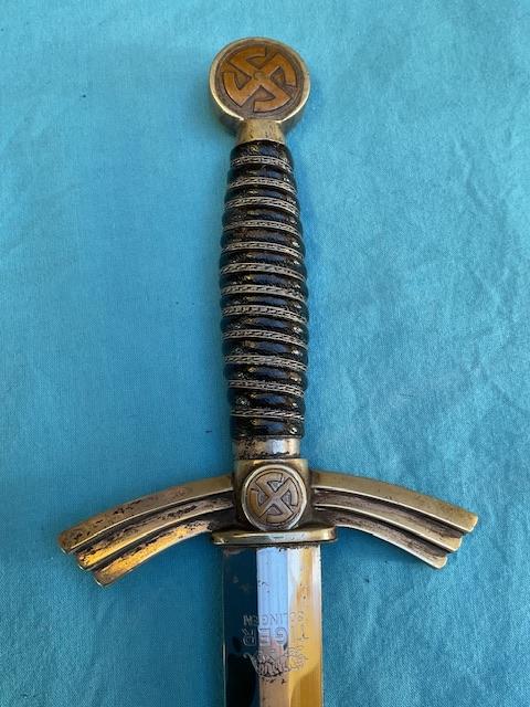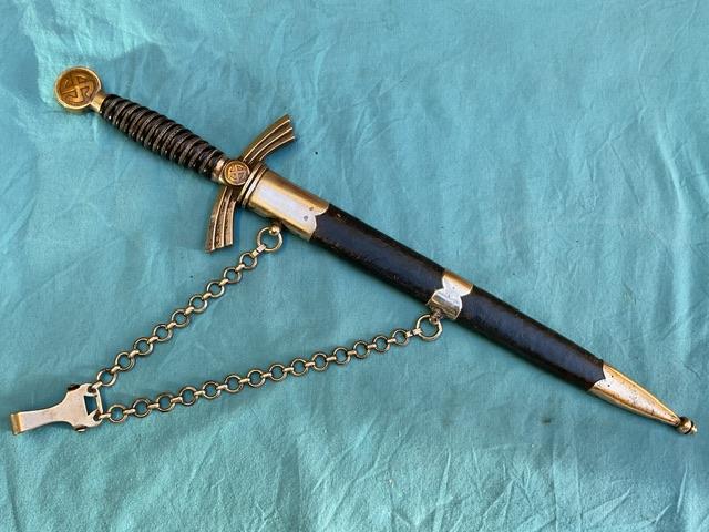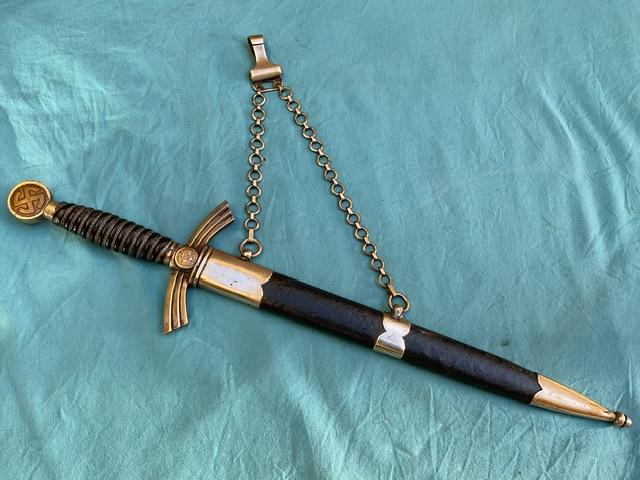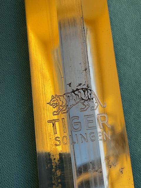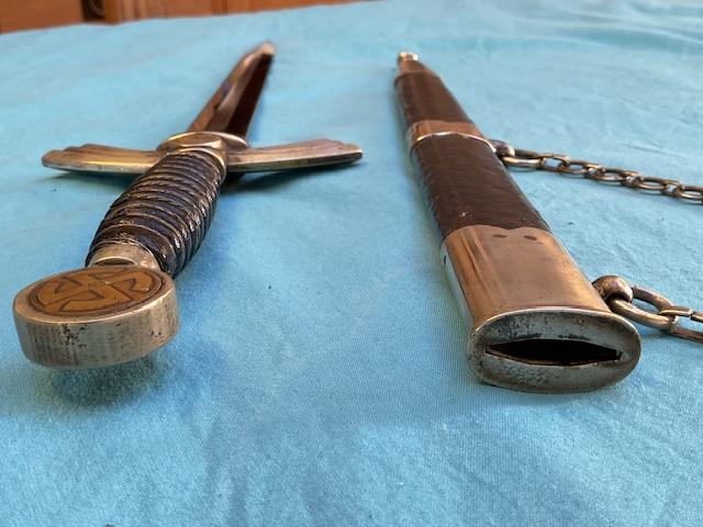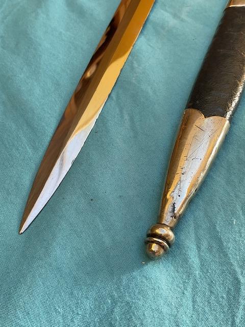 Scarce maker to find. Rust free blade, leather scabbard in excellent condition. Cross guards and chain nickel silver. Wire to grip id nice and tight, leather to grip shows minor wear. Overall EX+