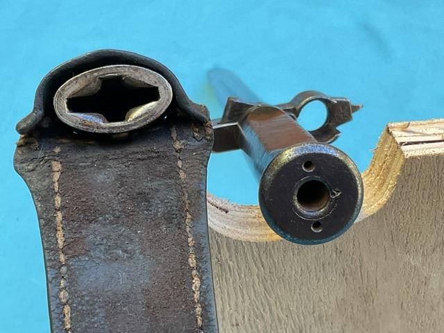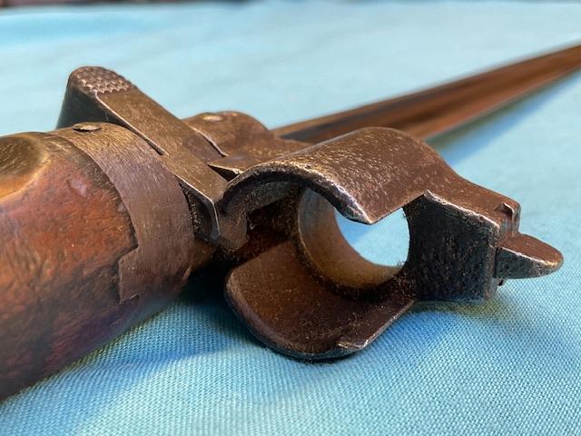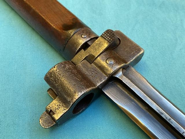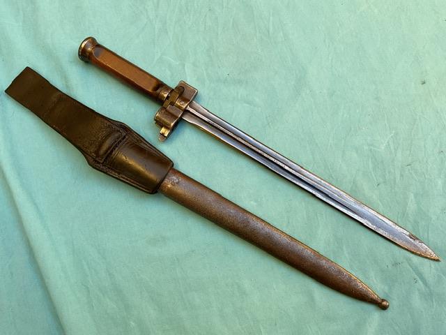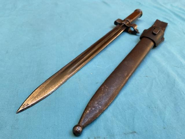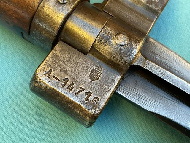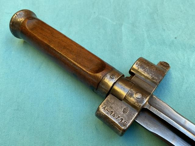 A rare 1935 cavalary Hungarian bayonet, the blade is in excellent condition. Wood grip is in perfect condition, locking mechanism in good working order.Comes with frog