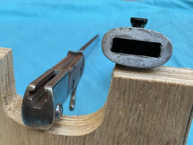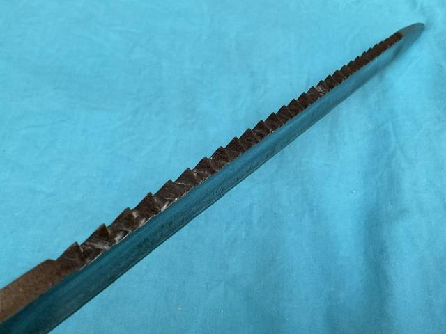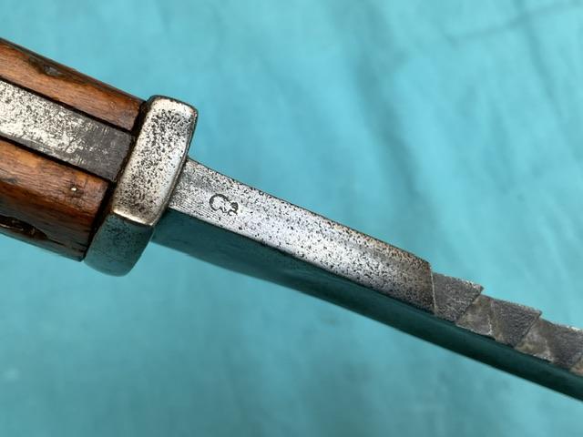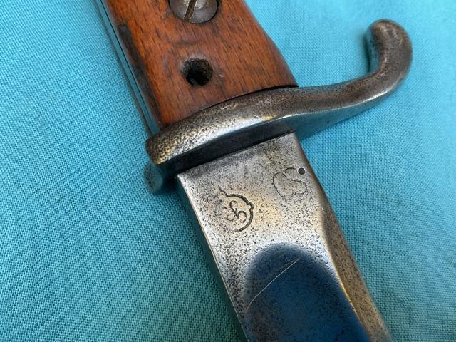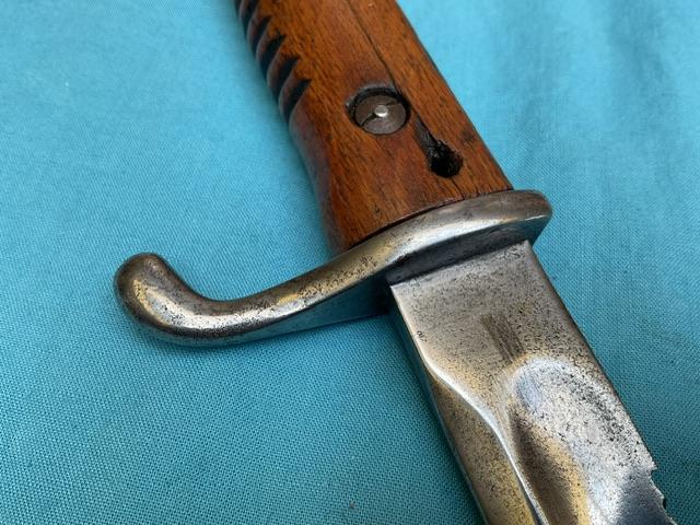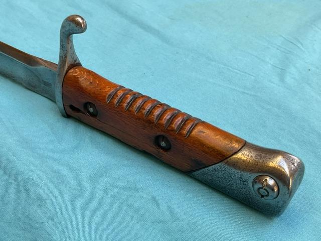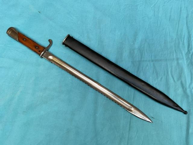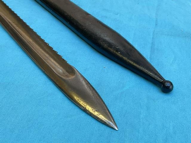 An excellent example of a very rare bayonet, blade is rust free, 1 piece wood grip has no splits, press stud works. Black painted scabbard in excellent condition.