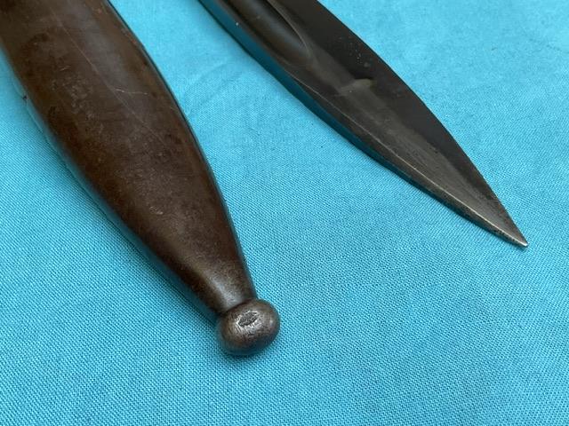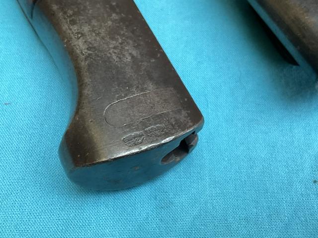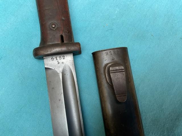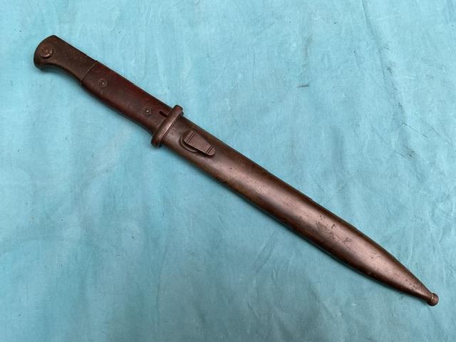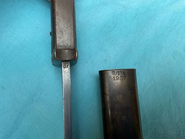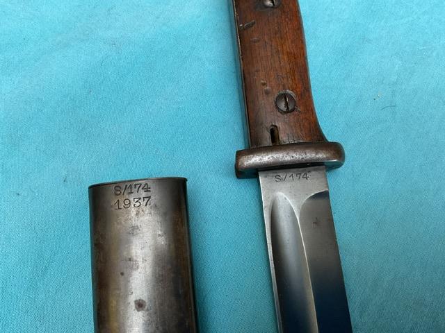 A 1937 dated S174 code K98 bayonet. Nice blued blade, near mint. Grip in good order, press stud works, nice dent Green scabbard.