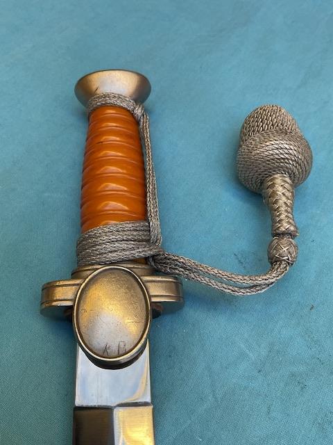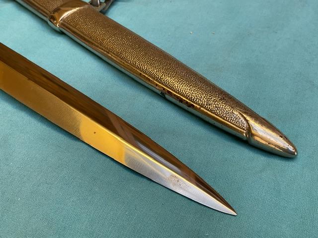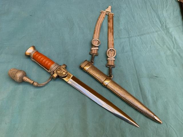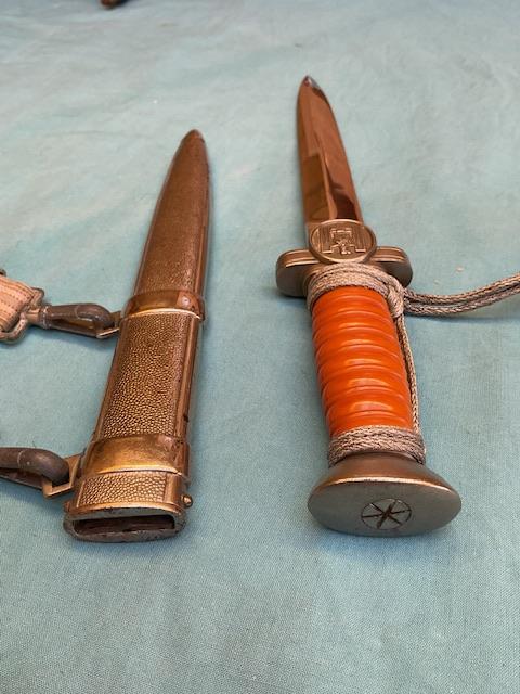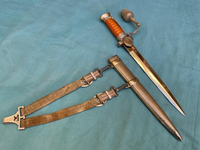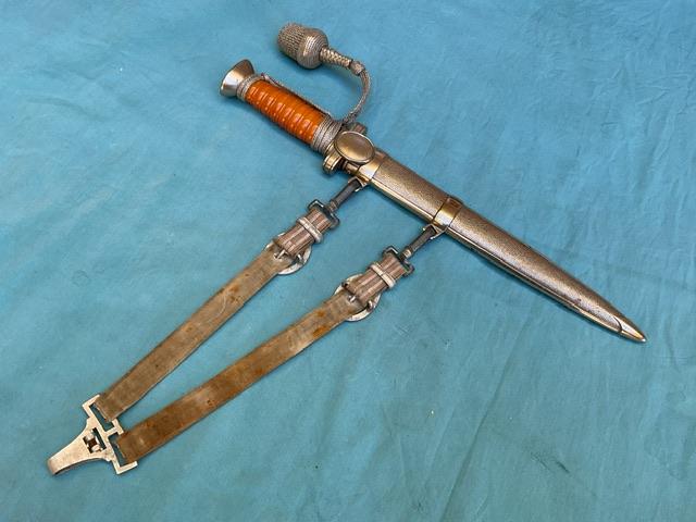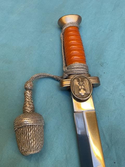 A excellent example of Red Cross leaders dagger, blade is near mint with no rust or nicks. Scabbard shows minor wear, perfect grip. Excellent knot with minor wear. Comes with hangers.