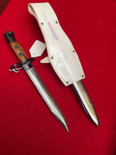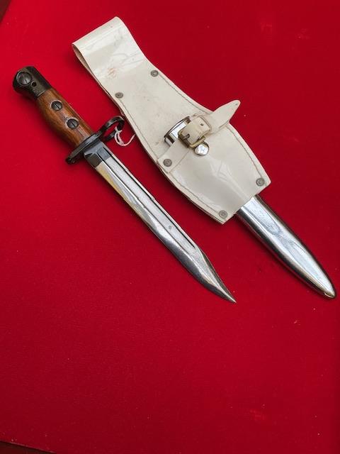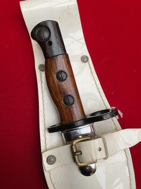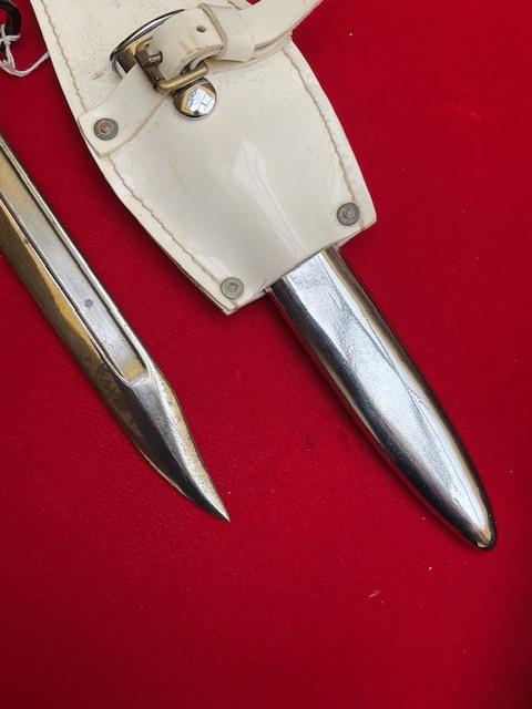 A nice example of dress bayonet, pommel and cross guard painted black, grip varnished, blade and scabbard chrome plated. With frog.