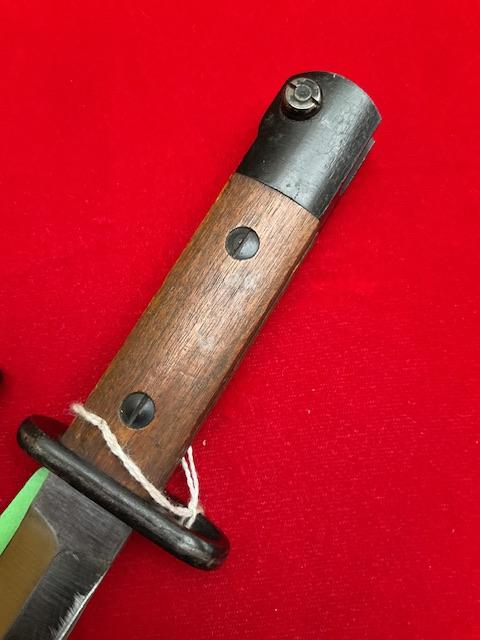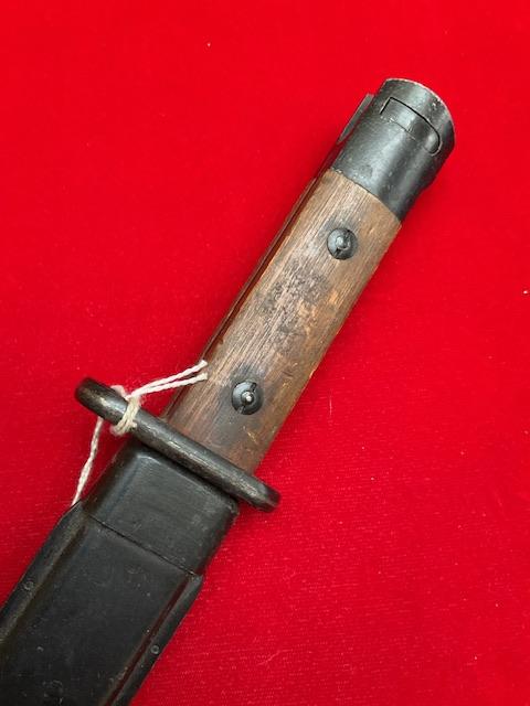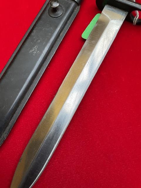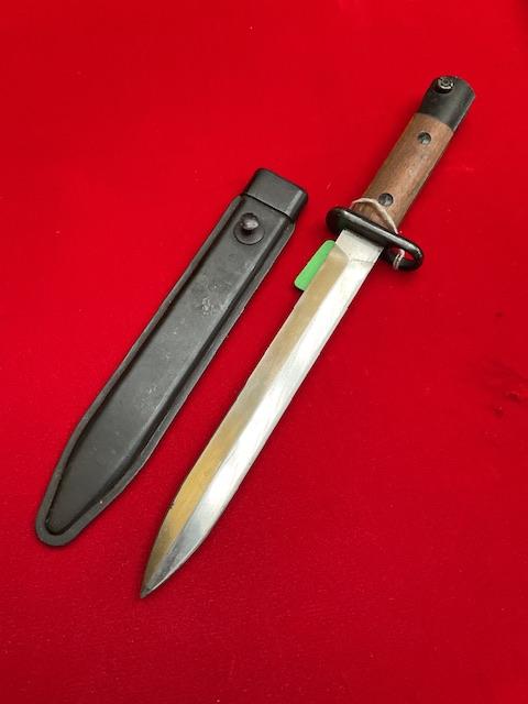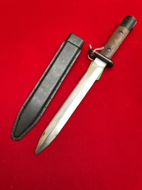 A nice conditioned 1947 Madsen, bright rust free blade, locking catch works, dent free scabbard.