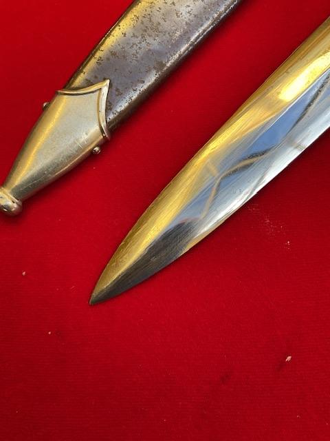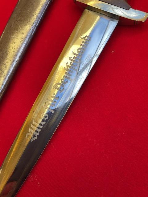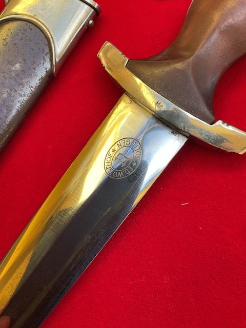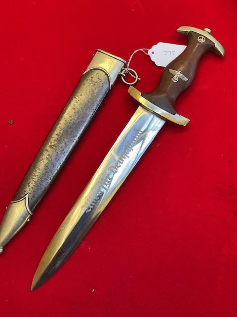 Nice SA dagger, blade has minor runner marks, but dent and nick free. Cross guards and grip excellent fit with no chips. Anodised scabbard, dent free, all nickel fittings, screws unturned, Overall EX++ item