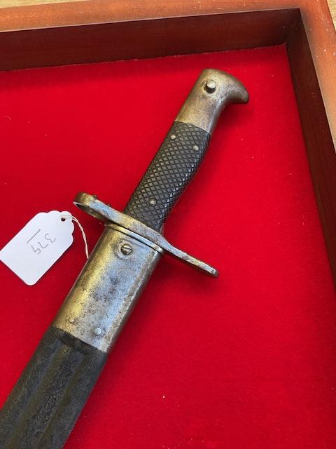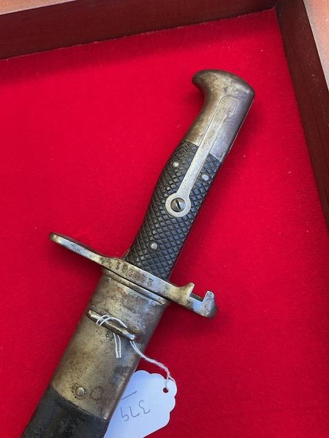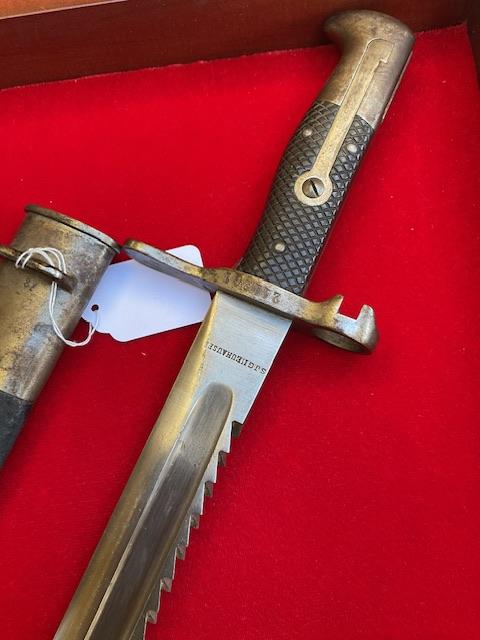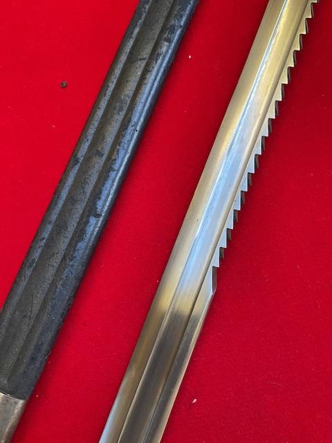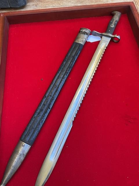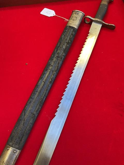 This is the earliest saw back used on the vetterli and Schmidt Rubin bayonets. Blade in excellent order,grip held on by 3 rivets, press stud in working order. Leather scabbard has no tears, top and bottom mount securely attached. Scarce bayonet.