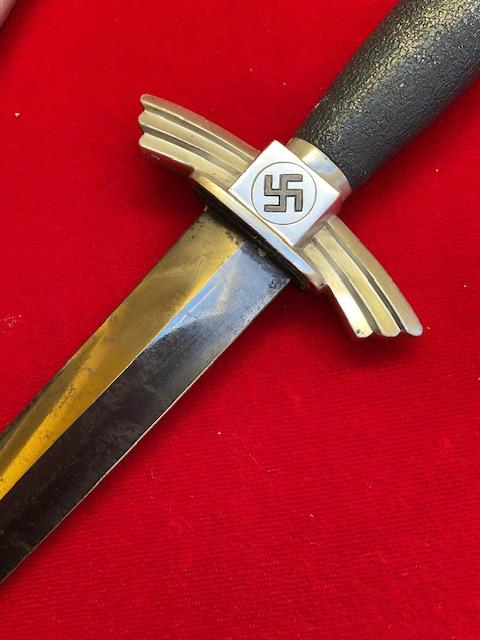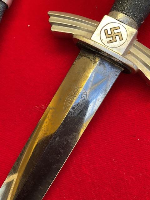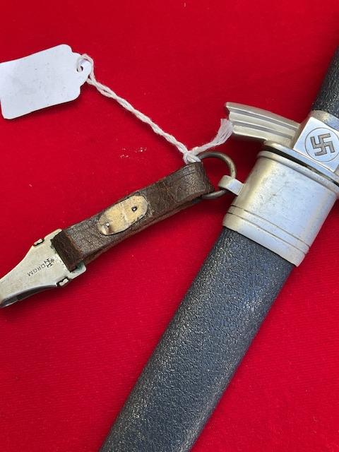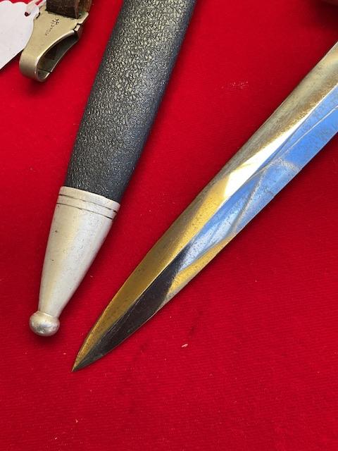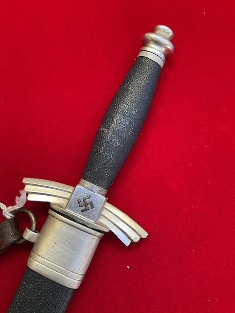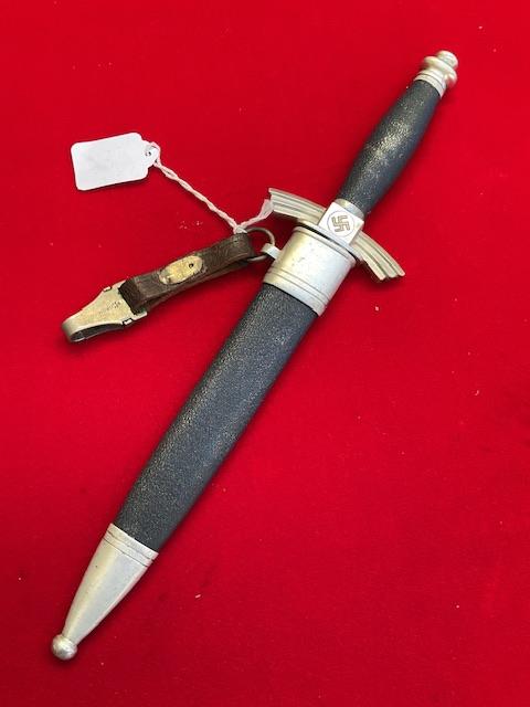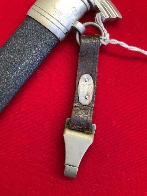 A scarce aluminium flyers knife by Helbig, which it should be. Excellent blade with some greying but no nicks or rust. Leather to scabbard and grip is perfect, all fittings in good order, all screws in tact and not turned.Comes with hanger. Nice scarce item