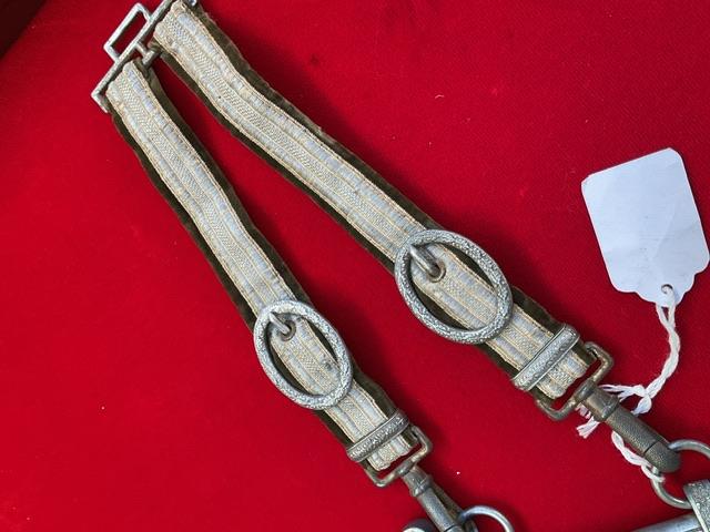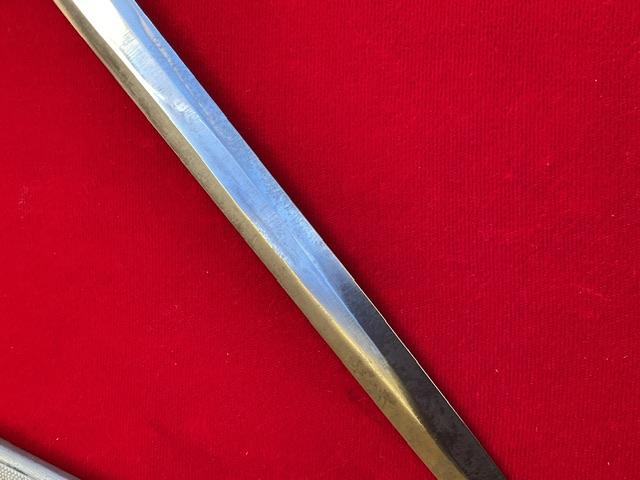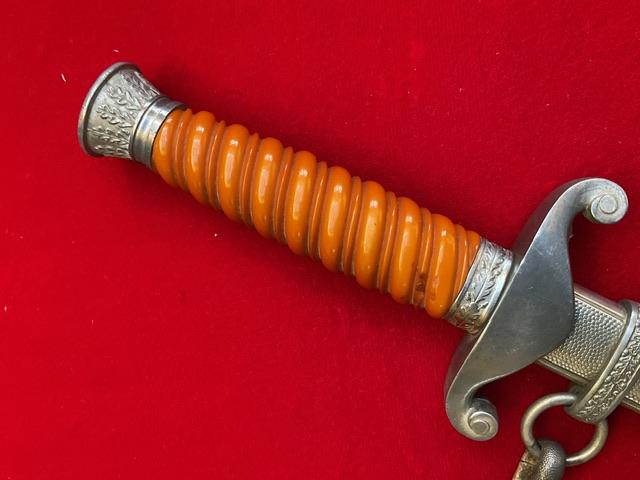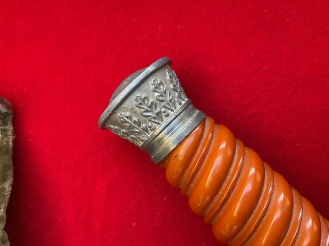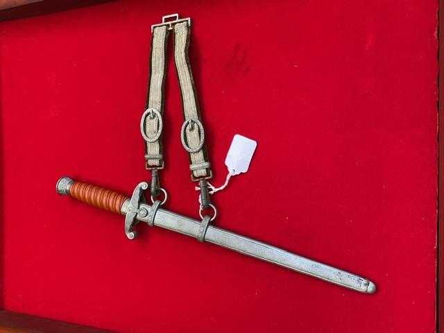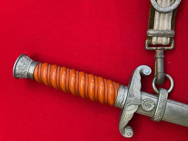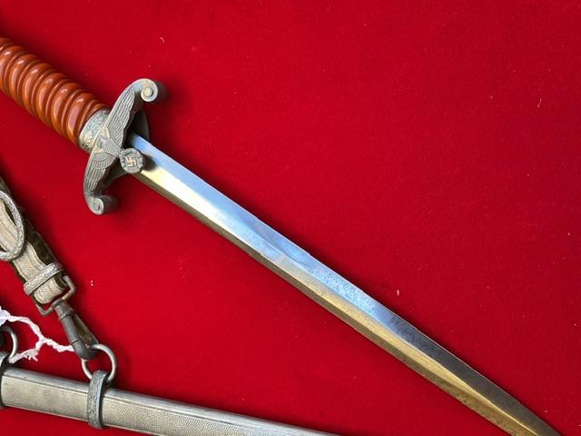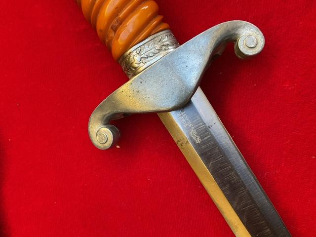 Later production army dagger by scarce maker Tiger. Blade shows some staining, but rust free, dent free scabbard. Nice orange grip, Comes with set of army hangers. Dagger does come apart. Scarce maker