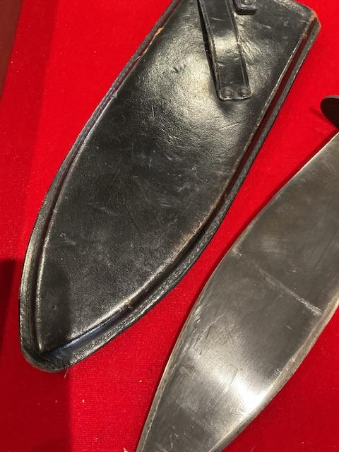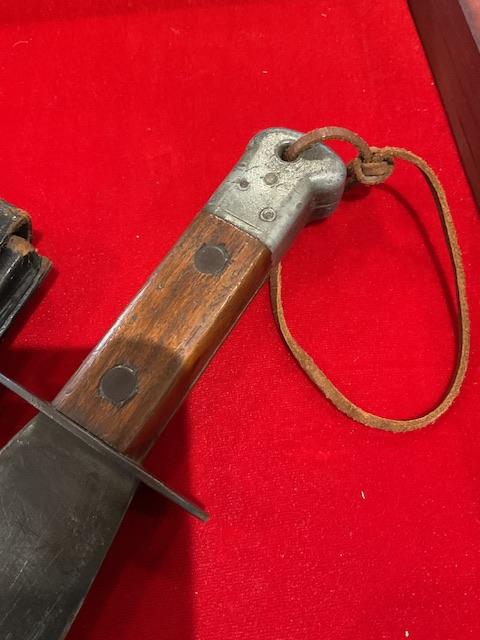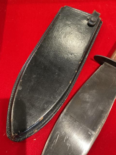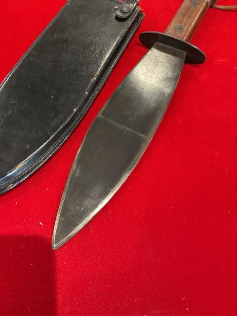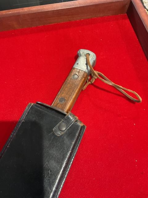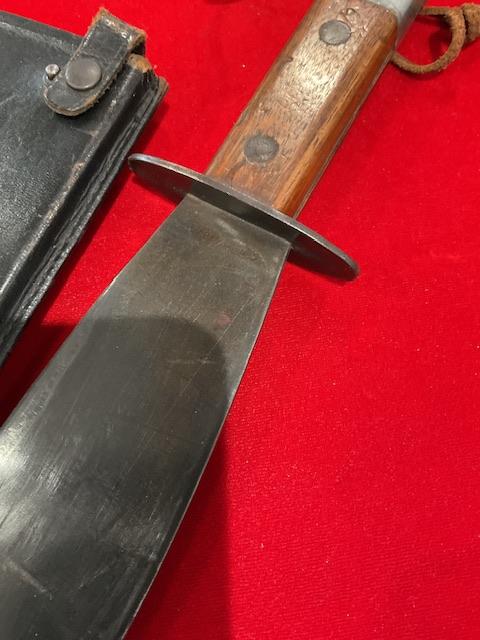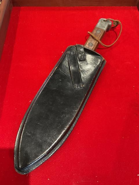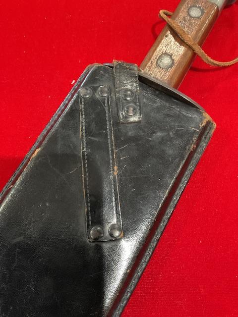A very good example of WW2 smatchet, grip in excellent condition, blue bladed, wood scabbard covered in leather, retaining strap in excellent condition. Nice condition for this item