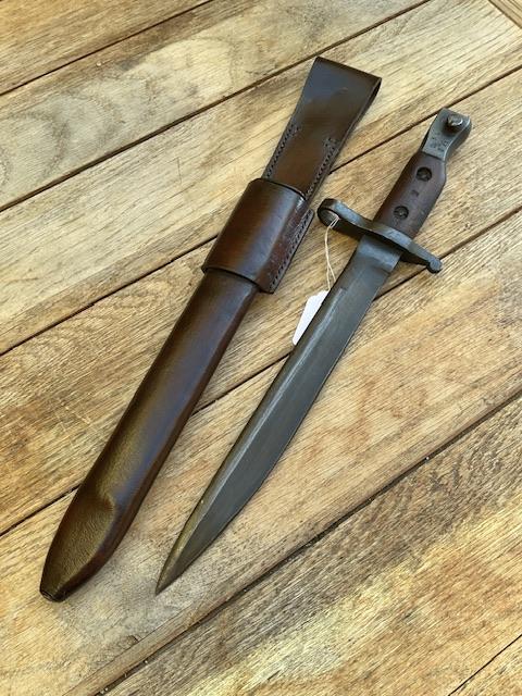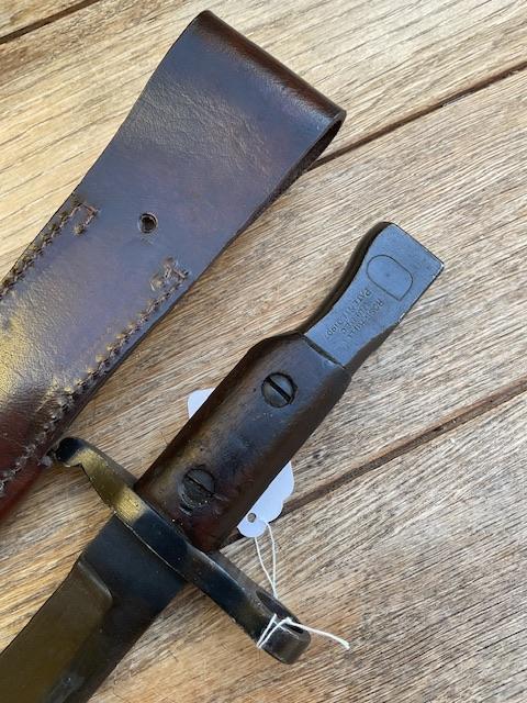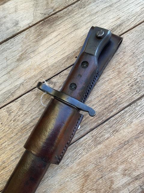 A very mint example of 2nd pattern Ross bayonet, superb blued blade, grips in excellent order, press stud working order. Scabbard and frog near mint condition, very hard to up grade.