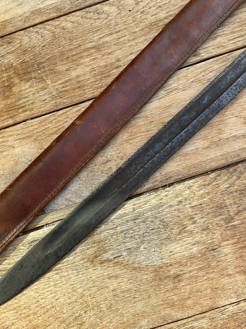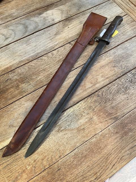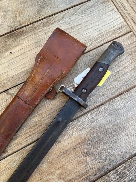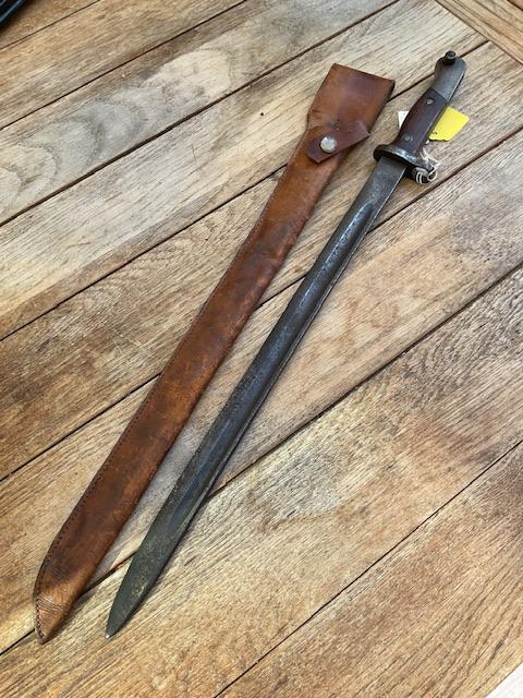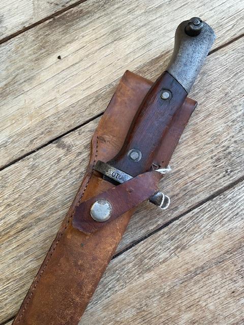 Scarce Chinese bayonet modelled on the German Mauser, blade is of crude construction, good wood grips,, press stud in working order, leather scabbard and retraining clip in good order, nice scarce item