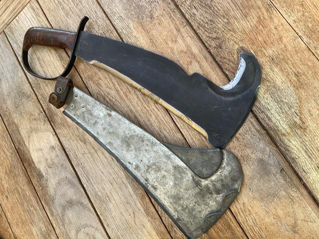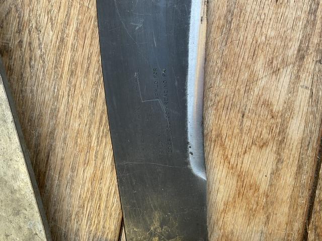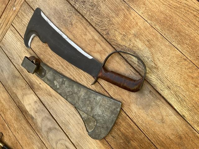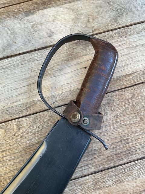 An excellent example of a woodmans pal survival machete, blued blade with no nicks in blade edges, no chips in grip. Metal scabbard with retaining loop in good order.