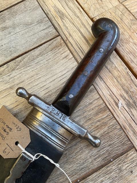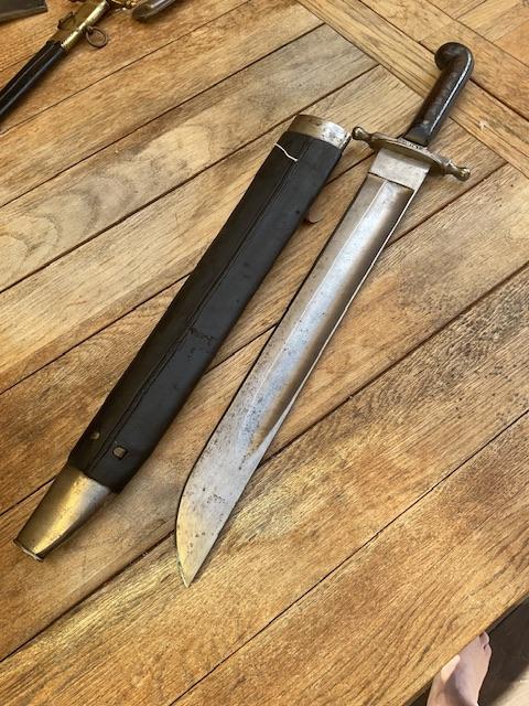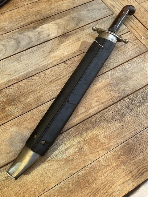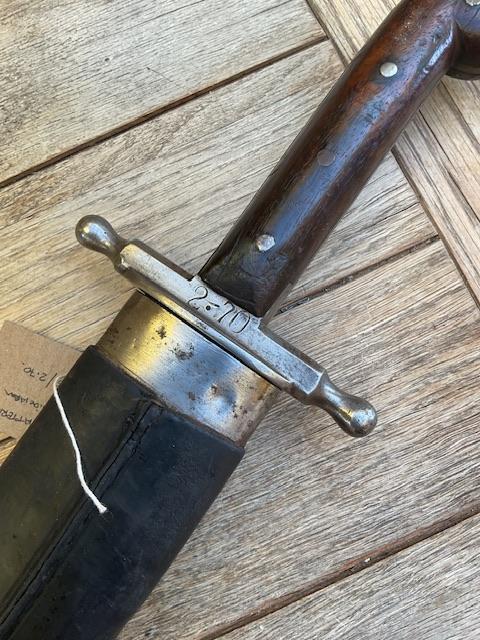 A nice example of 1853/89 Pattern sidearm, excellent blade, scabbard leather is near perfect, wood grips does not have any chips etc