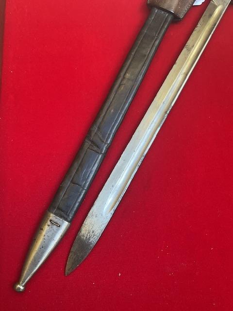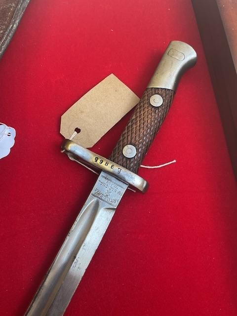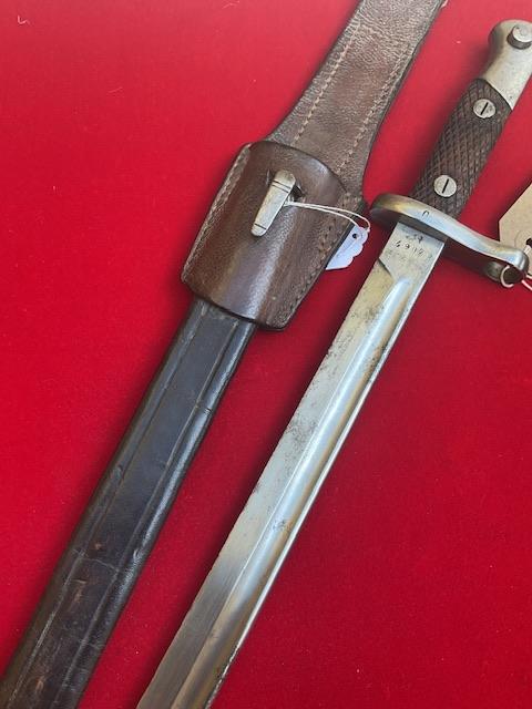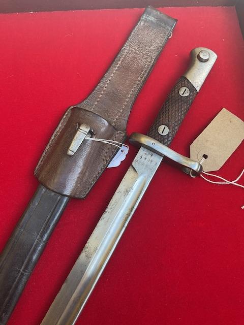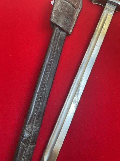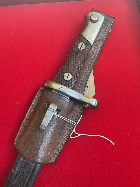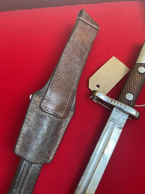 Used on model 1916 Carbine, excellent wood grip, press stud working nice blade and scabbard and ones with excellent leather frog