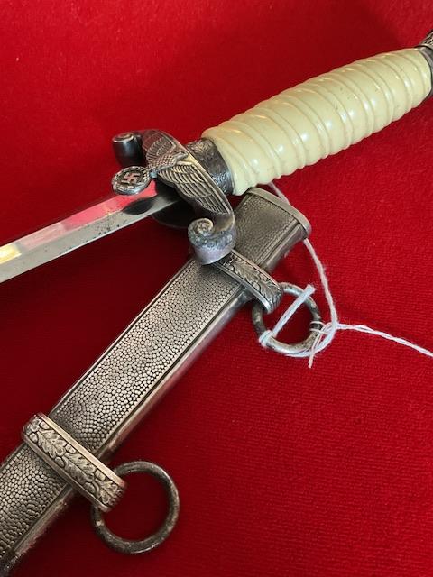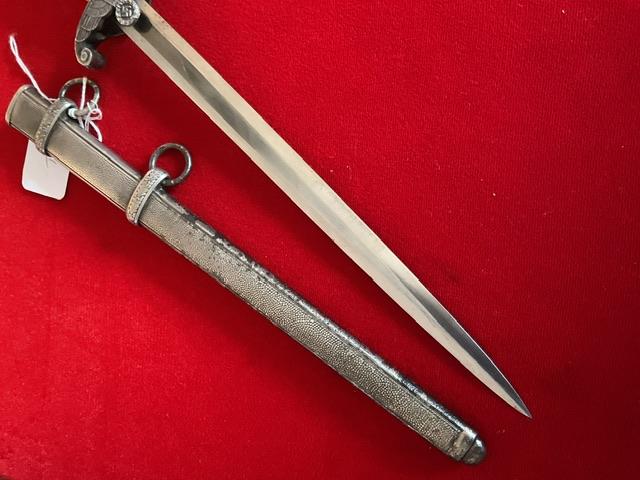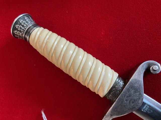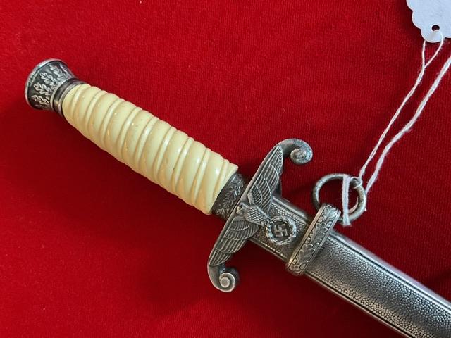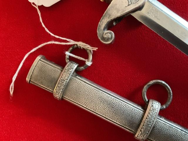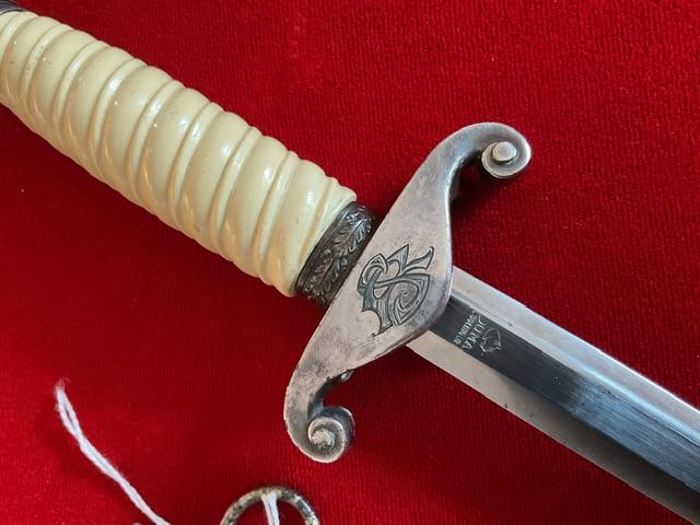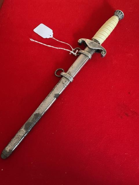 Scarce maker marked dagger, blade in excellent condition, white celluloid grip, 12 leaf pommel, nice personalisation on cross guard, dent free scabbard but has rust marks but in good condition, Overall a nice dagger with personalisation, and scarce maker.