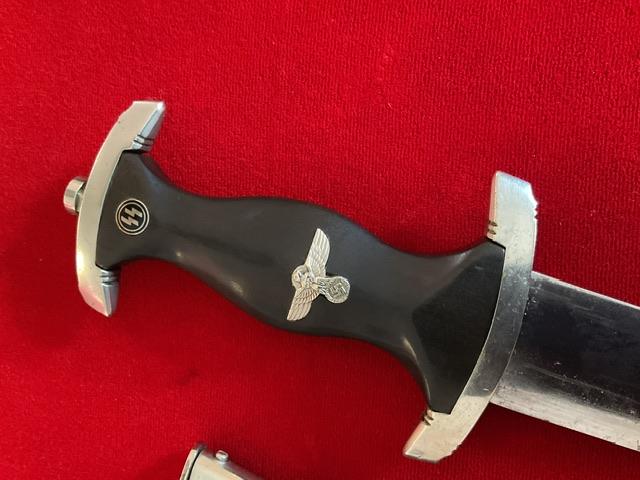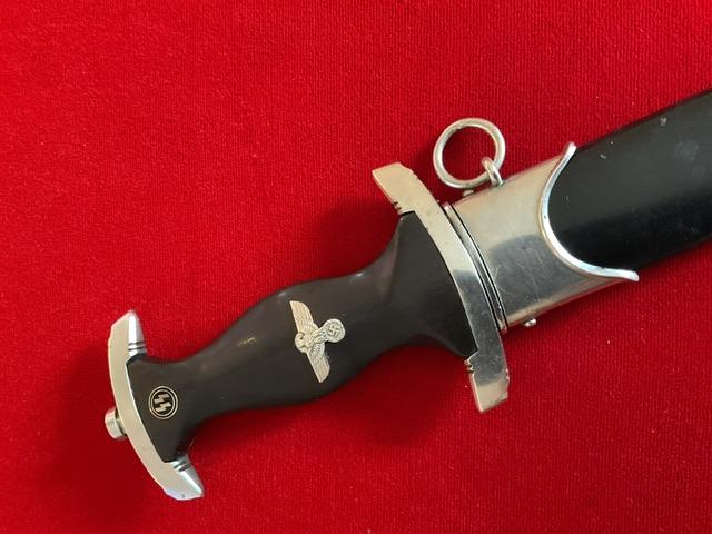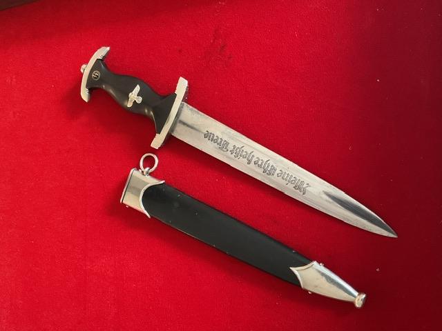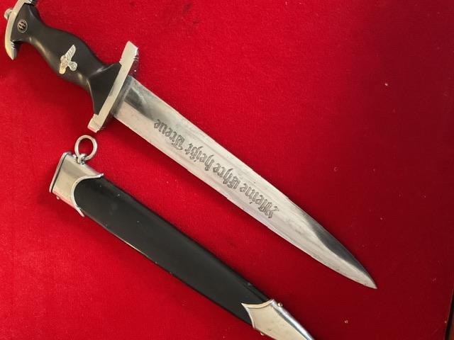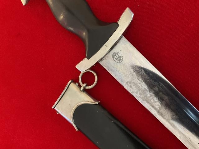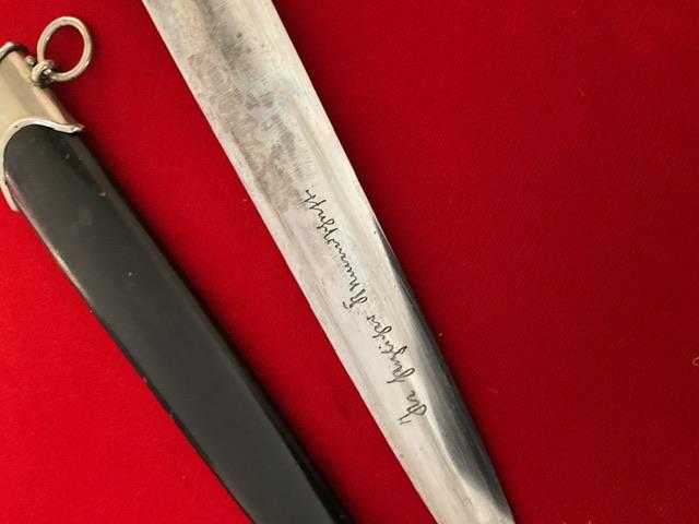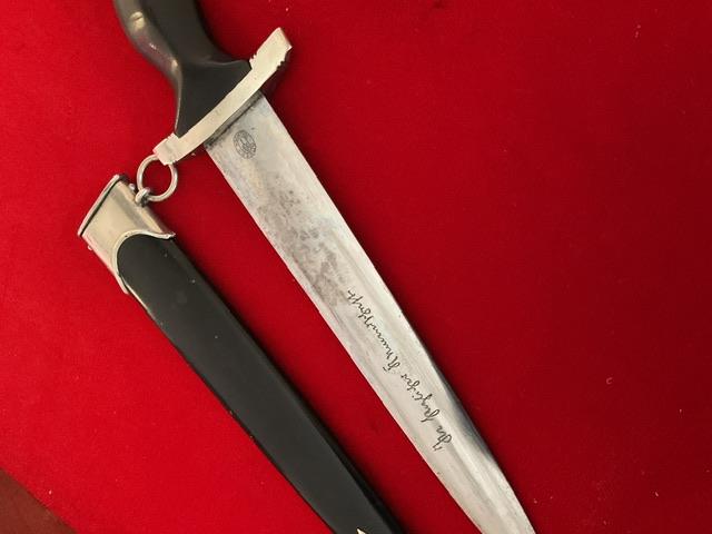 Name only erased Rhom dagger by Boker, blade in excellent condition, no nicks or rust marks. Rhom inscription field removed, grip in excellent condition, all nickel fittings.Dent free painted scabbard, slight dent to bottom ball. Nice rare item.