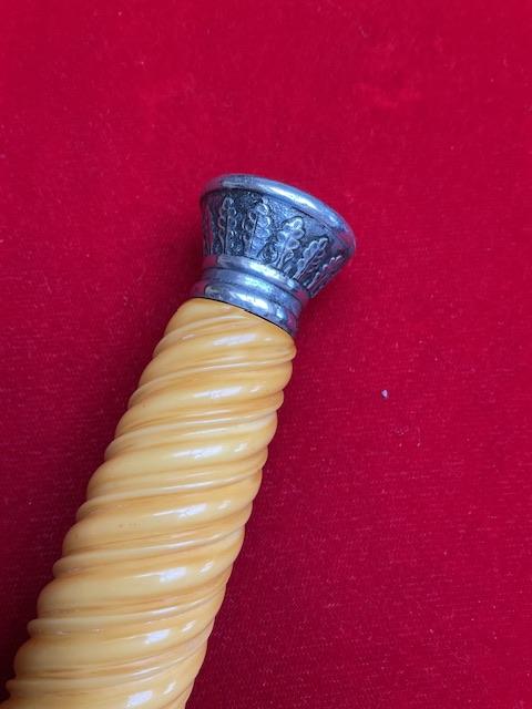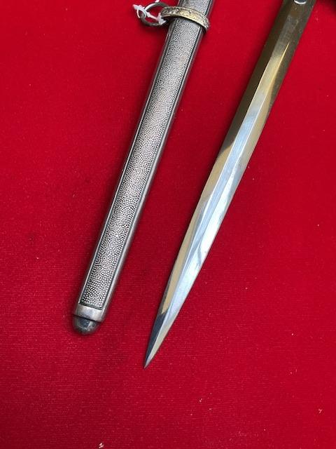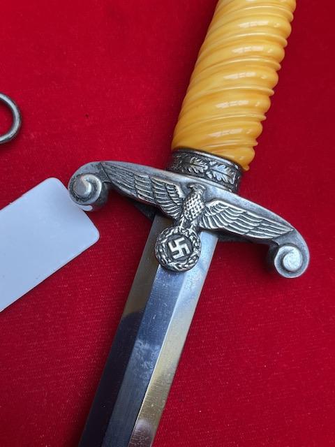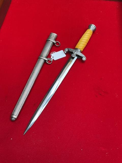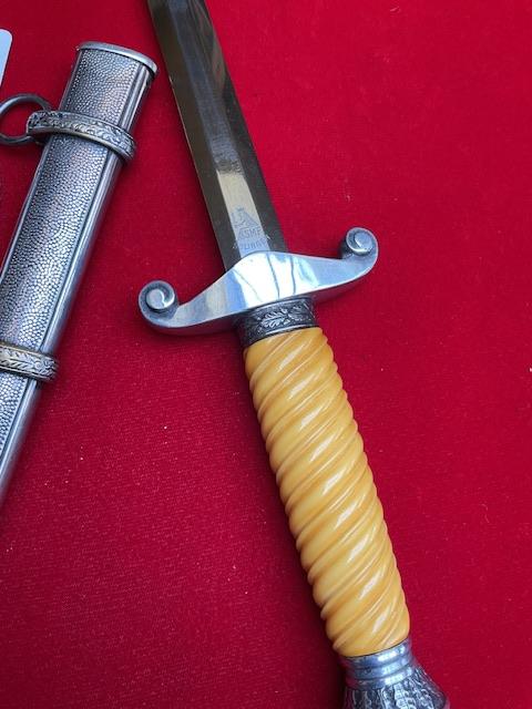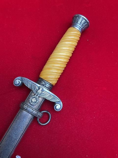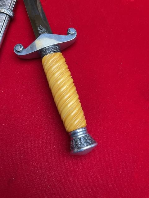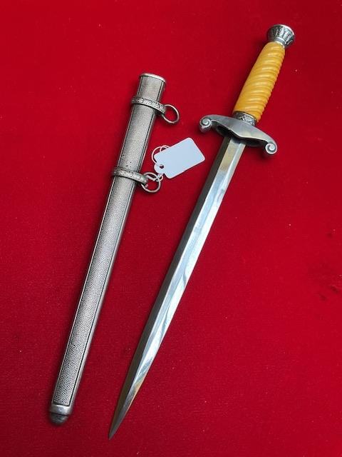 A stunning looking army dagger, very scarce maker SMF, and gorgeous lemon yellow slant grip,m chip free. nice bright blade, dent free scabbard, 12 leaf pommel. A very attractive rare army dagger