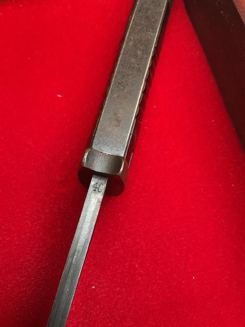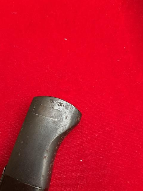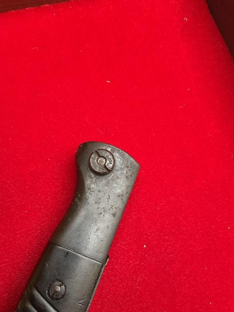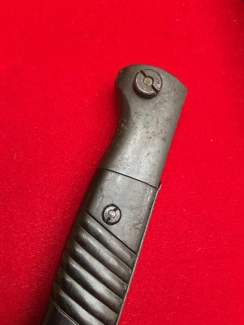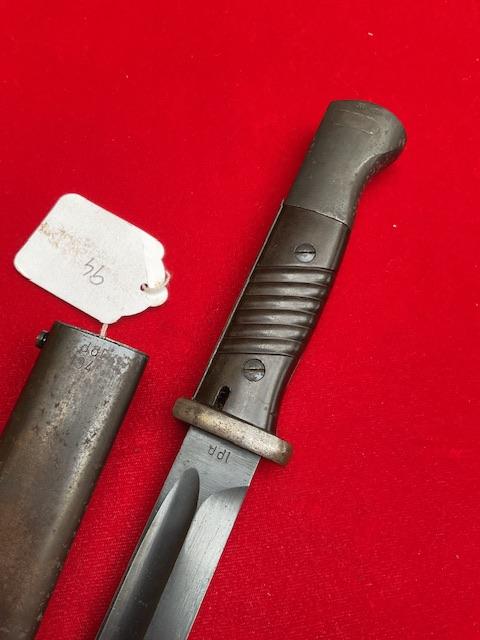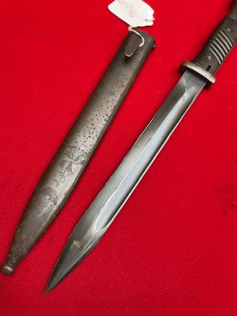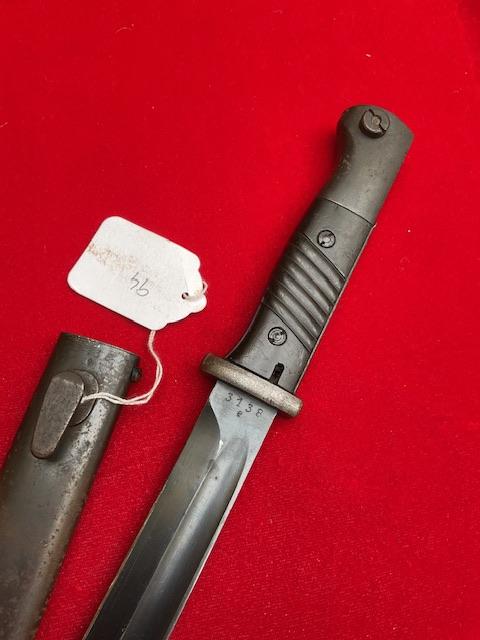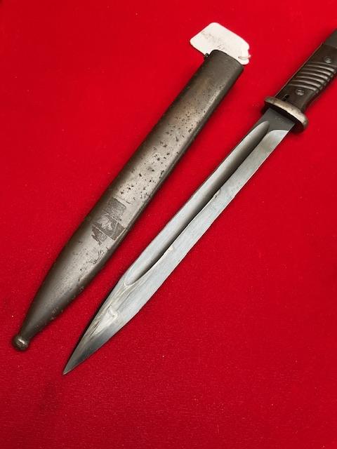1940 dated K98 by Joshua Corts, matching number, nice blued blade, dent free scabbard, press stud in working order. Nice scarce bayonet.
