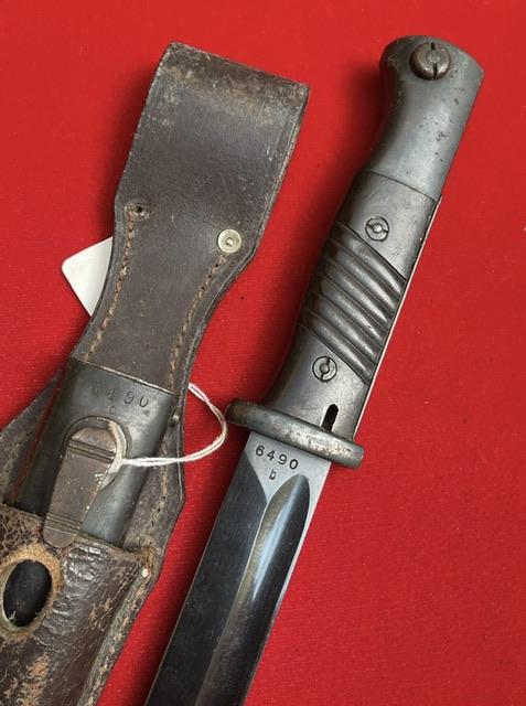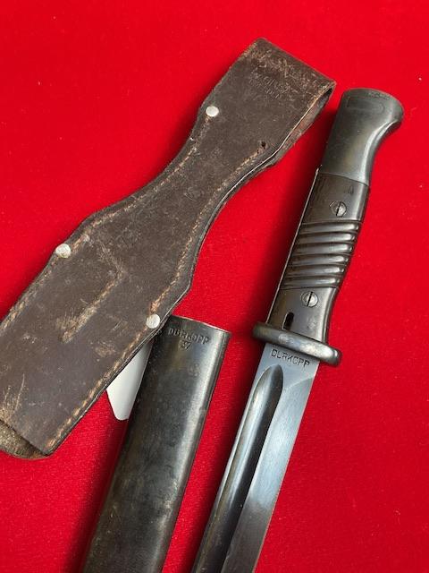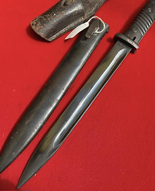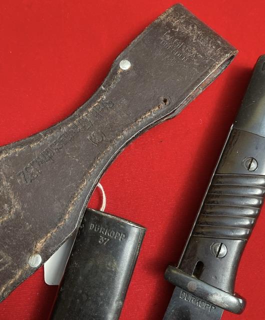 Nice condition K98 by Durkop, matching numbers but dated 37 on scabbard and 38 on blade. Excellent blued blade, press stud in working order.Dent free scabbard, comes with dated and maker marked frog.