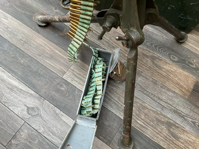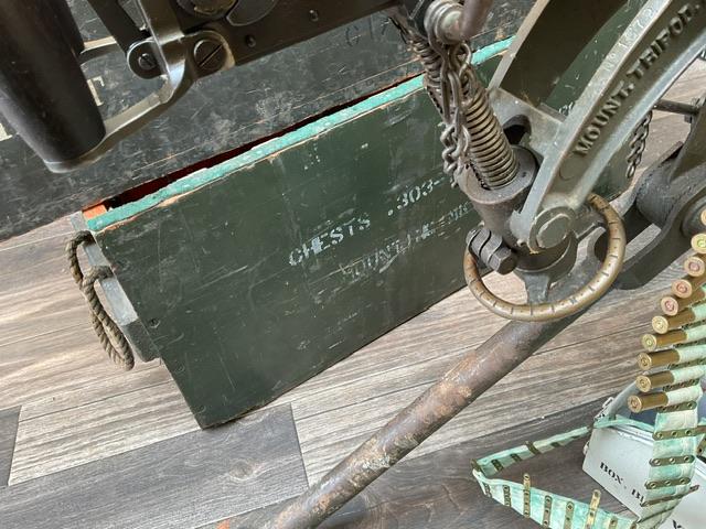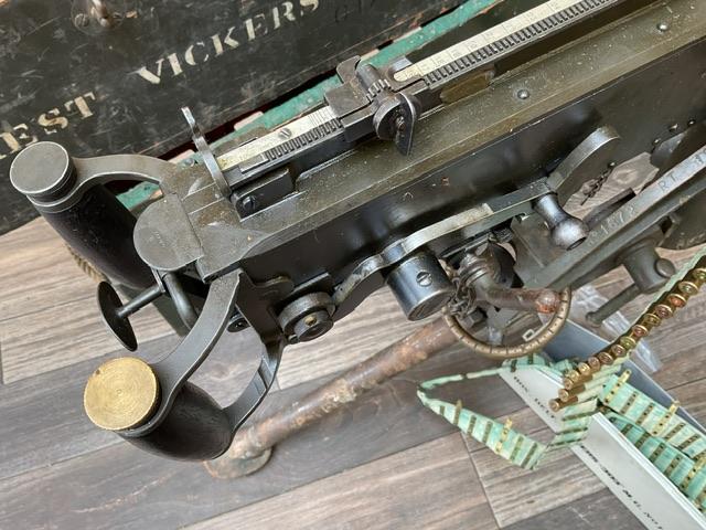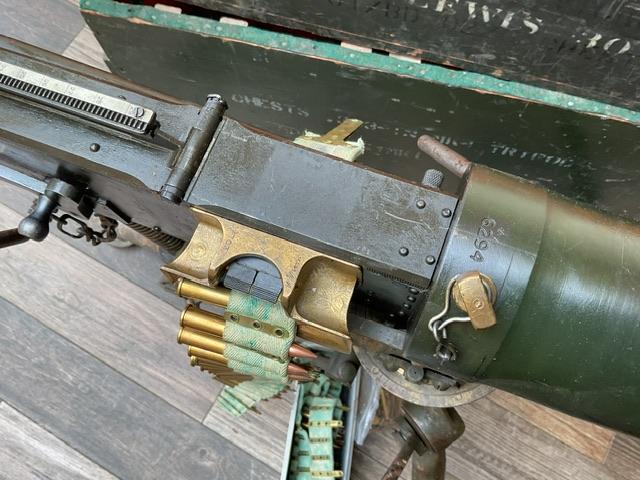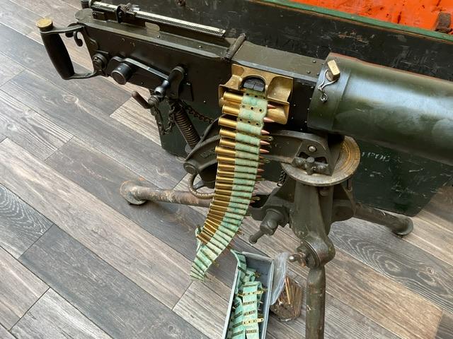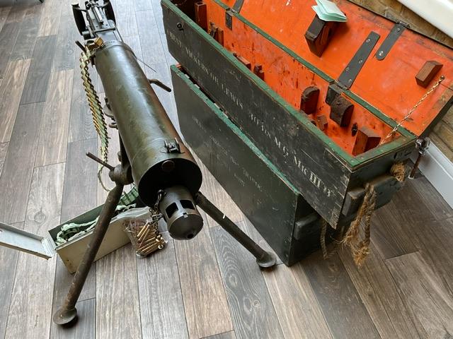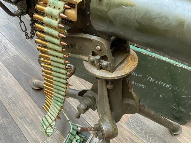 WW2 Vickers, in excellent condition, comes with ammo belt and around 100 inert rounds in white ammo box. Comes in shipping crate, lid to tripod box is missing.