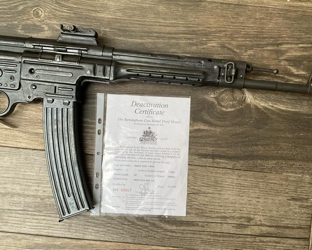 A very rare deactivated gun to find, old spec MP43, cocks and dry fires, matching magazine 1995 Cert. Excellent condition for and a very rare item to find.