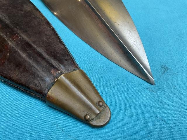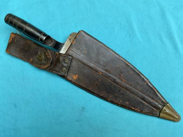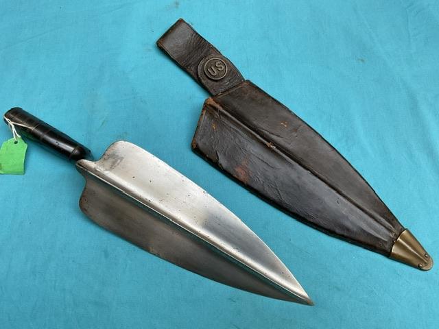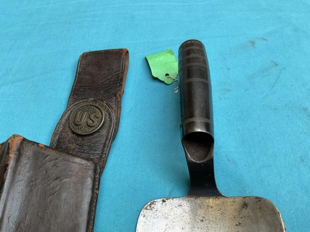 A lovely example of a USA 1873 trowel bayonet it a very hard to find leather scabbard. Bayonet shows related age but no rust or nicks, Swivel to grip turns easily. The nice part is the scabbard which is intact with belt loop still still attached and all brass fittings.