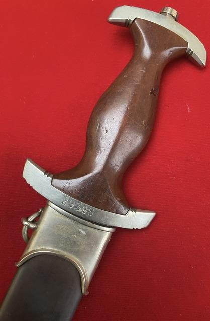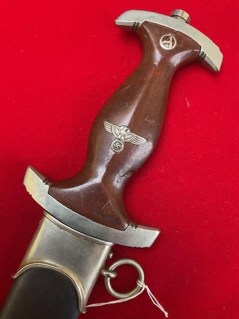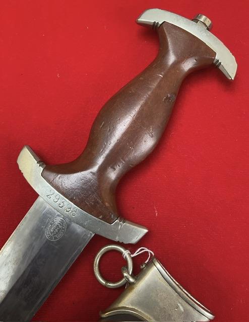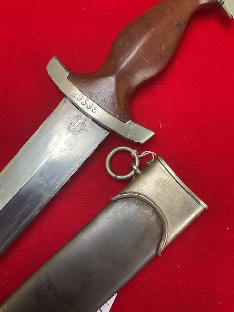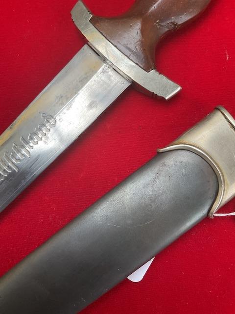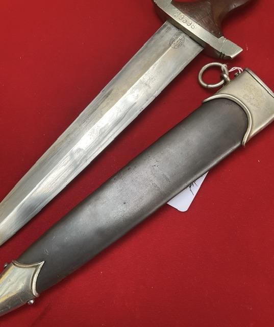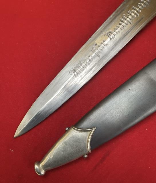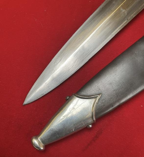 Factory erased Rhom dagger by Eickhorn, blade in excellent condition, no nicks or rust just usual wear. Numbered cross guard, dent free scabbard, 1 screw missing from top mount.