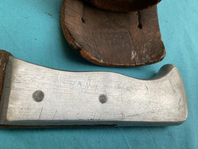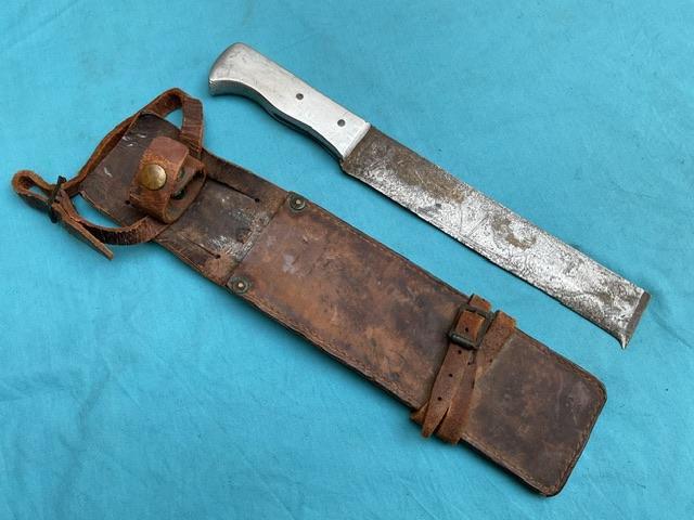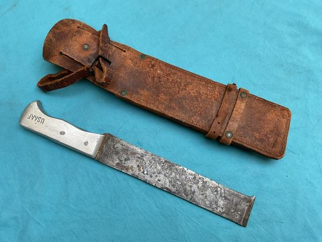A good example of an Australian Air Force Survival Knife, marked USAAF as used during WW2, alloy grip with name scratched in, Complete with leather scabbard complete with restraining straps. Nice rare item