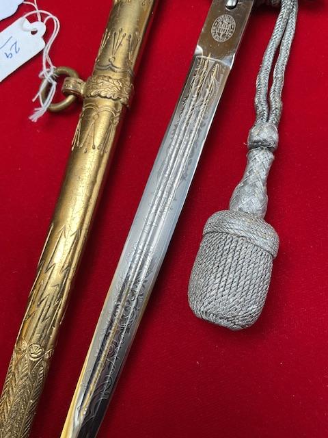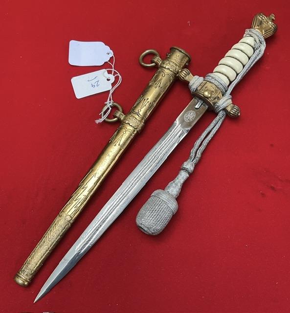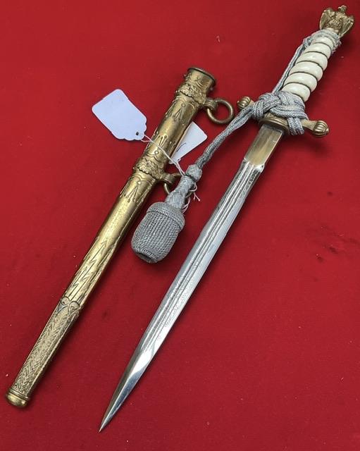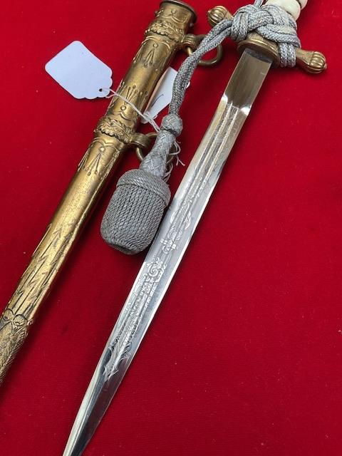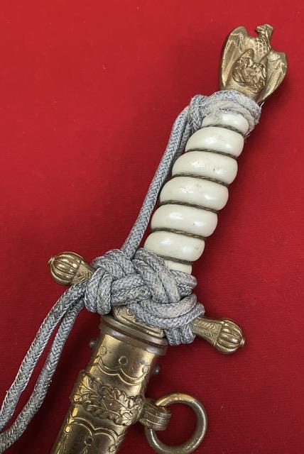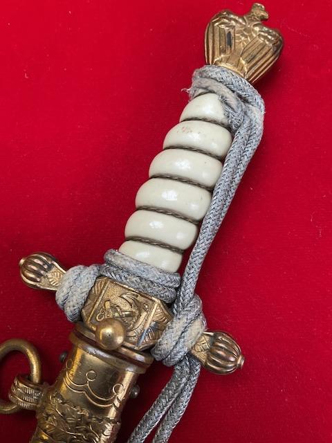 Near mint sailing ship blade, dent free scabbard which has some lacquer remaining. White grip with nice tight wire, Comes with knot in excellent condition.