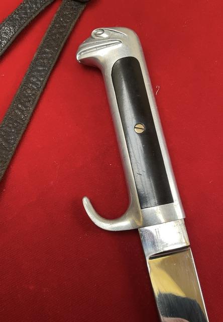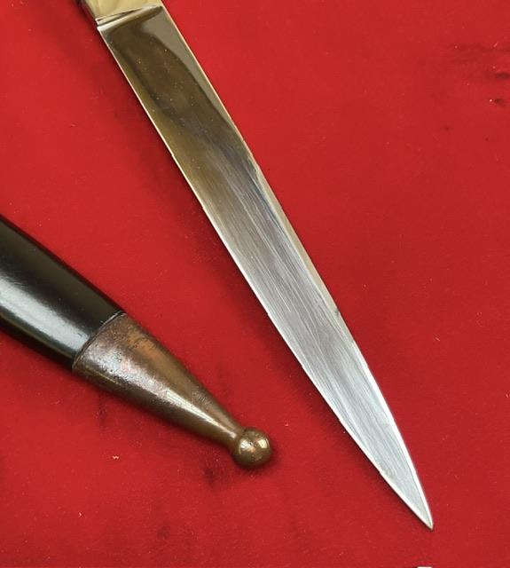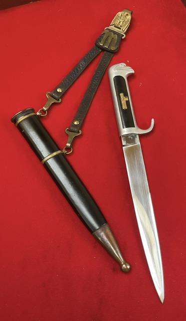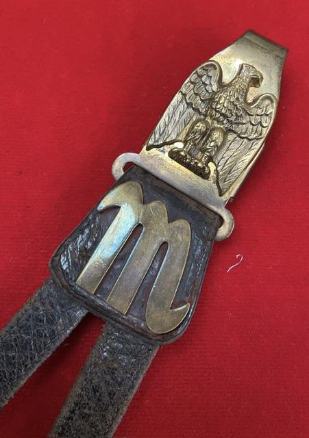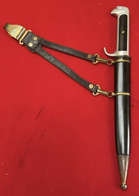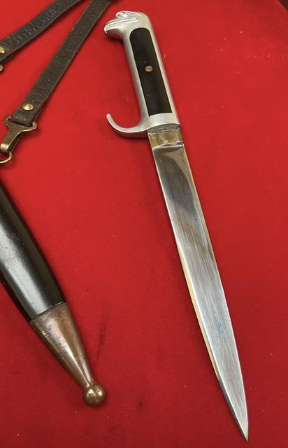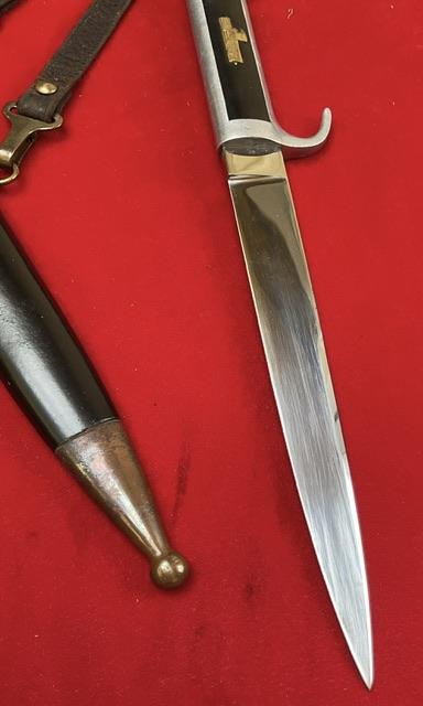 A near mint example of an Italian 1937 Fascist dagger, blade in excellent condition, paint to scabbard Near perfect with one minor chip, Comes with the harder to find leather hangers. Very nice dagger.