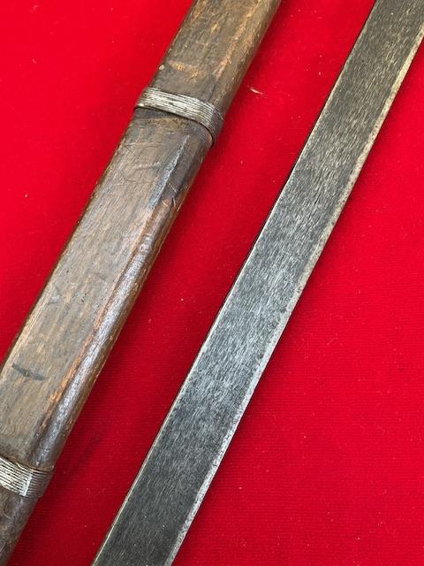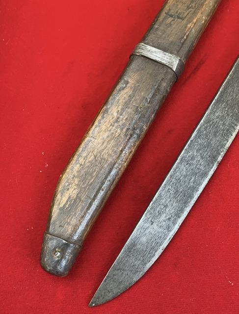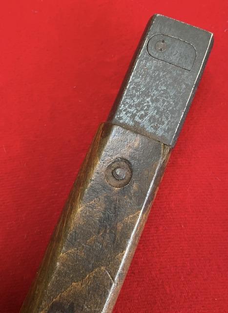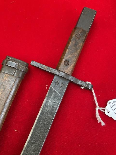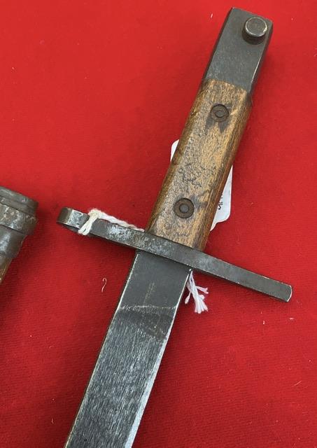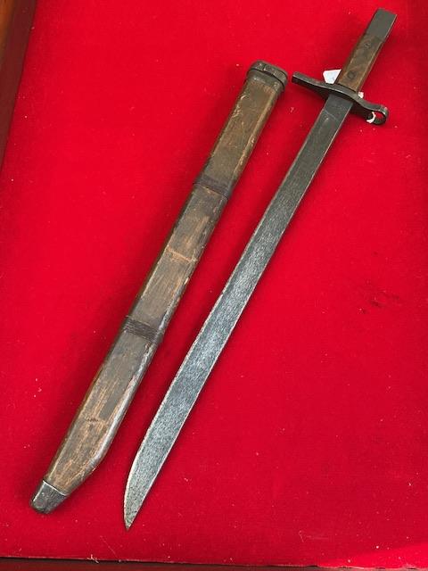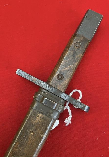 Late war Japanese Arisaka bayonet, double stamped blade, square pommel, press stud in good working order. Bamboo scabbard in excellent condition, bounding wires nice and tight, no splitting.