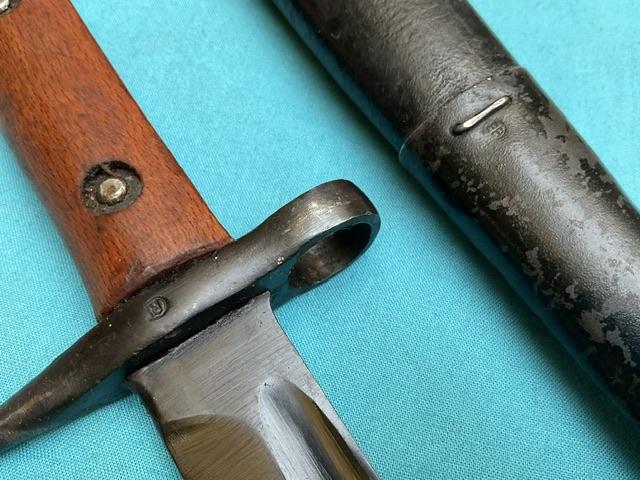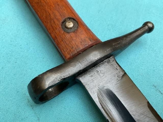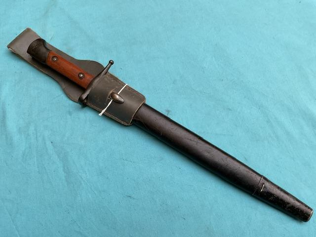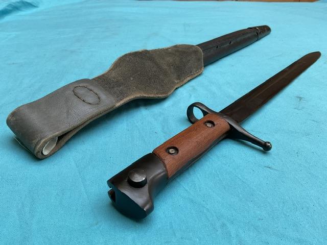 A very rare bayonet to find,An Italian 1891 converted to fit the SMLE rile, I have only ever come across 3 of these. Blade is blued and in near mint condition.Press stud works, excellent wood grips and comes in adapted leather scabbard . With Italian frog.