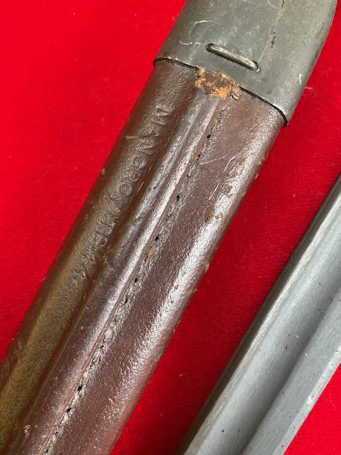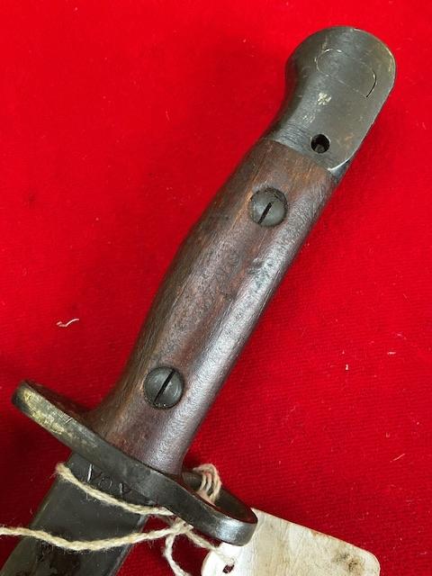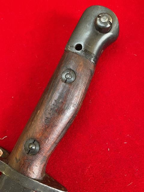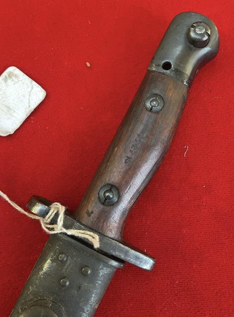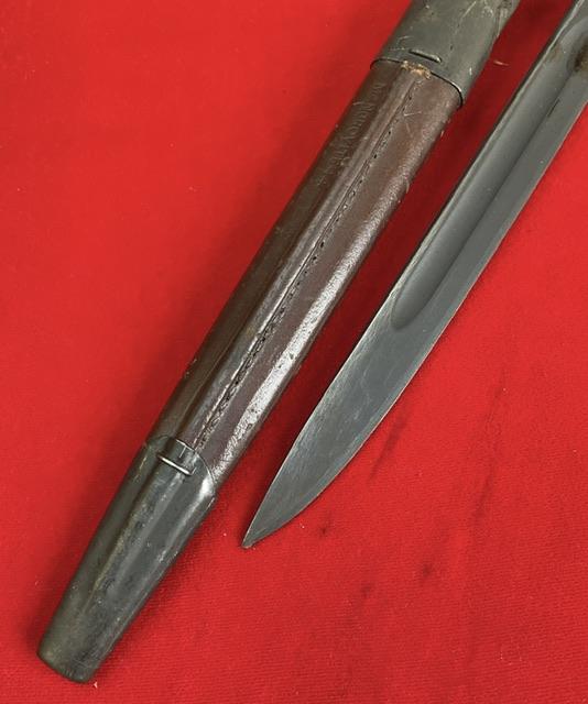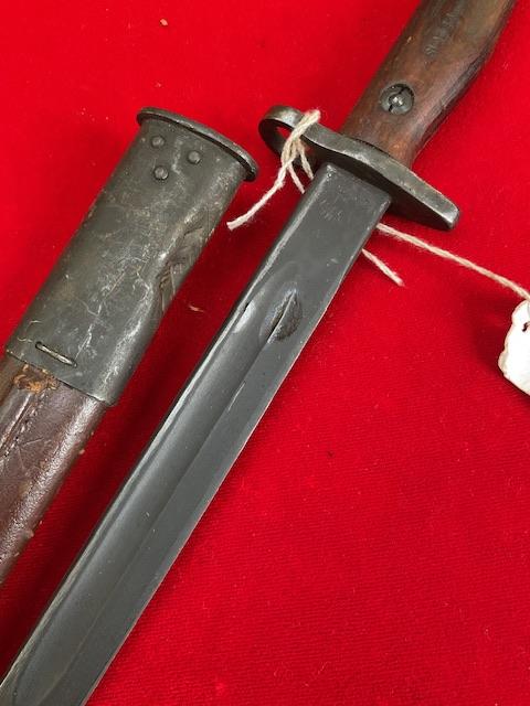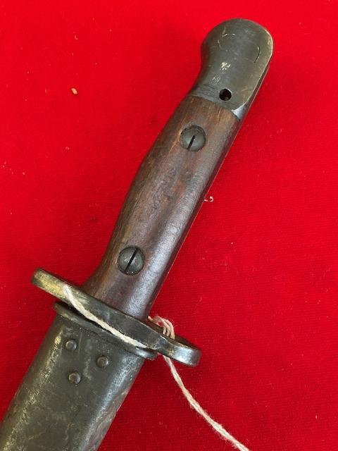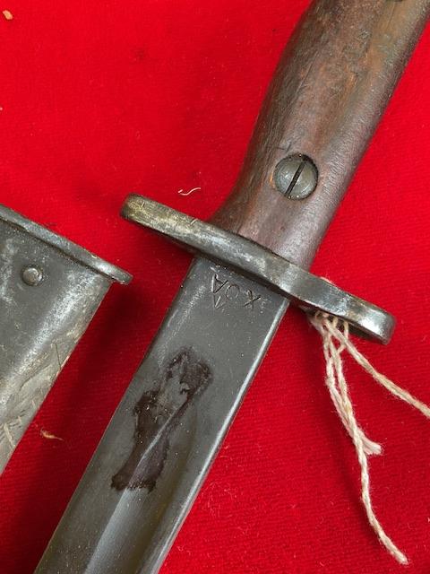 1944 dated Owen bayonet, excellent blued blade, grip in good order, press stud in working order.scabbard nicely marked up.
