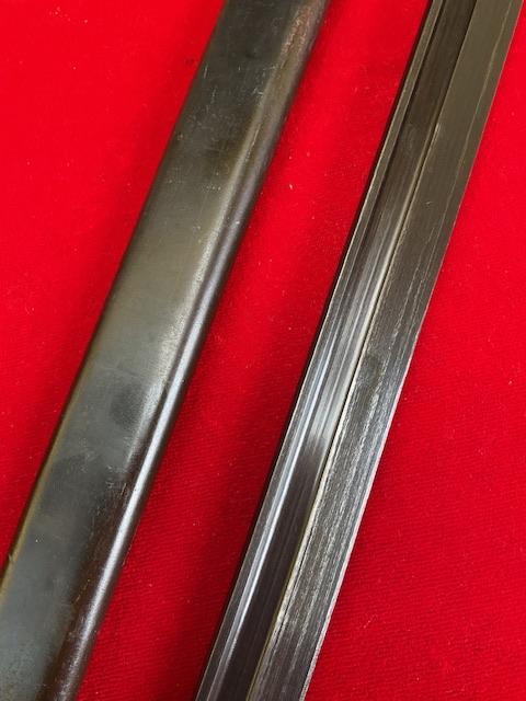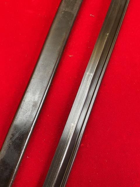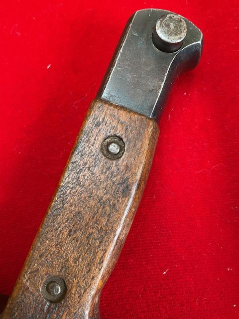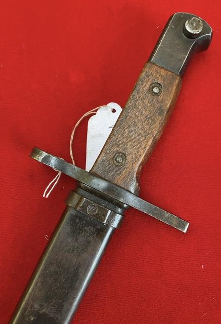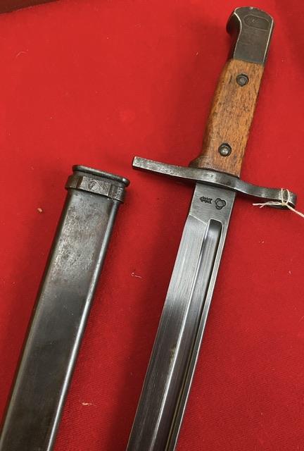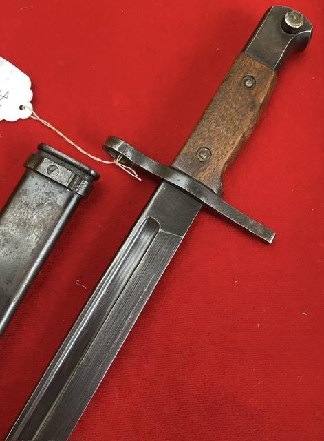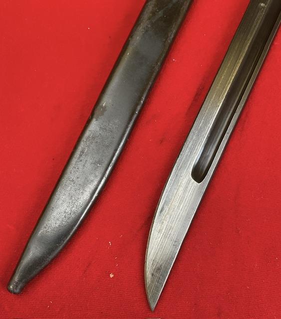 Arisaka bayonet made by Dennis Under Kokura, Excellent blued fullered blade. Dent free scabbard, straight cross guard and straight wood grips. Press stud in working order