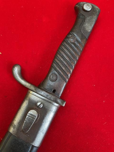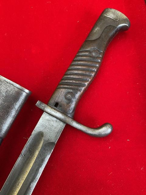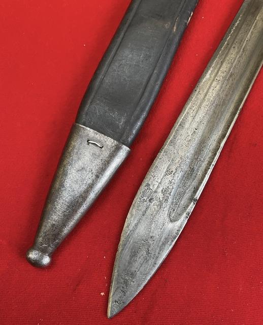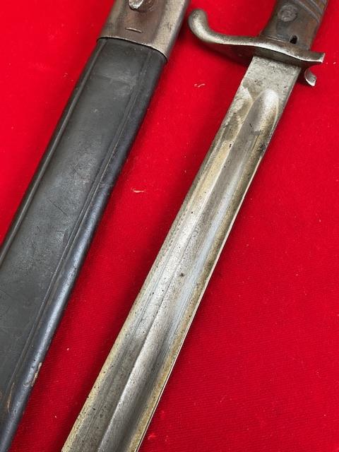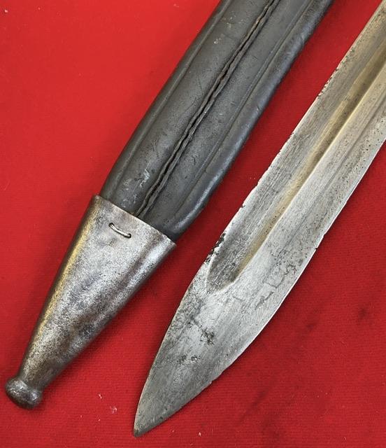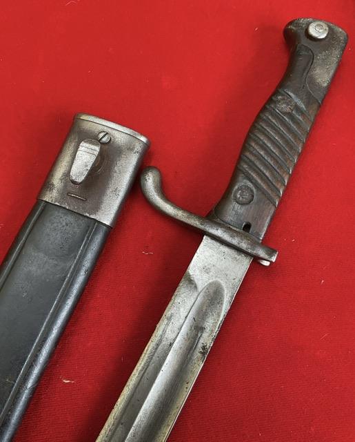 Early 98/05 bayonet by Simmons, 1915 dated, blade in good condition, leather scabbard with stitching intactact, bottom and top scabbard mounts well secured, grips in good order, no flash guard, long eared, press stud in good working order.